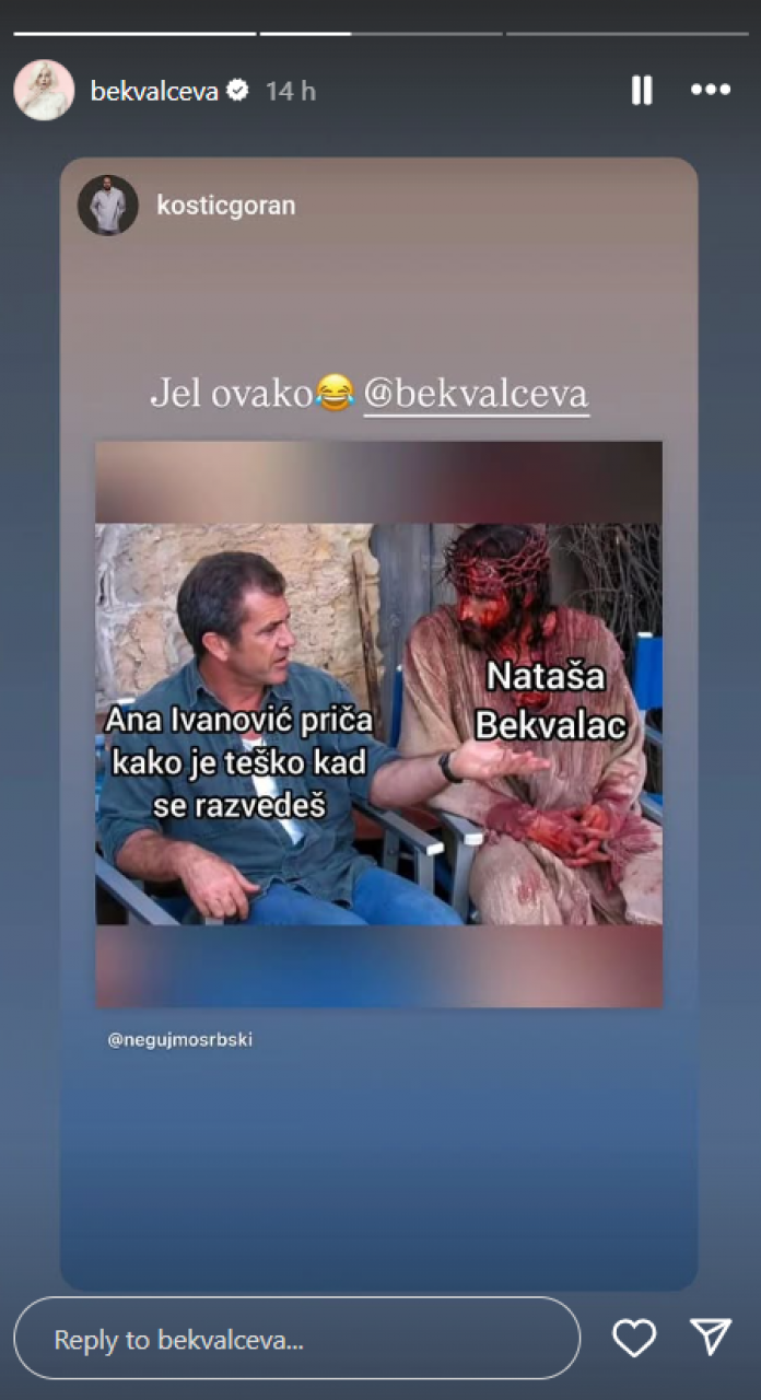 Nataša Bekvalac, koja je inače poznata po svom britkom humoru, objavila je na svom Instagram profilu fotografiju sa snimanja filma Pasija, na kojoj su Mel Gibson i glumac Džim Kavizel u ulogama Isusa i drugih biblijskih likova. Uz ovu sliku, Nataša je napisala: