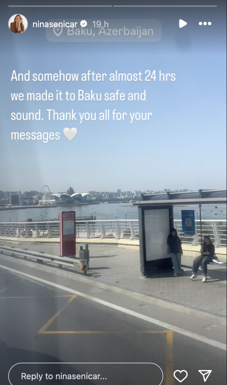 Nina Seničar je putem Instagram profila podelila fotografiju iz Bakua, uz poruku da je, nakon dugog i napornog puta, konačno stigla na sigurno.