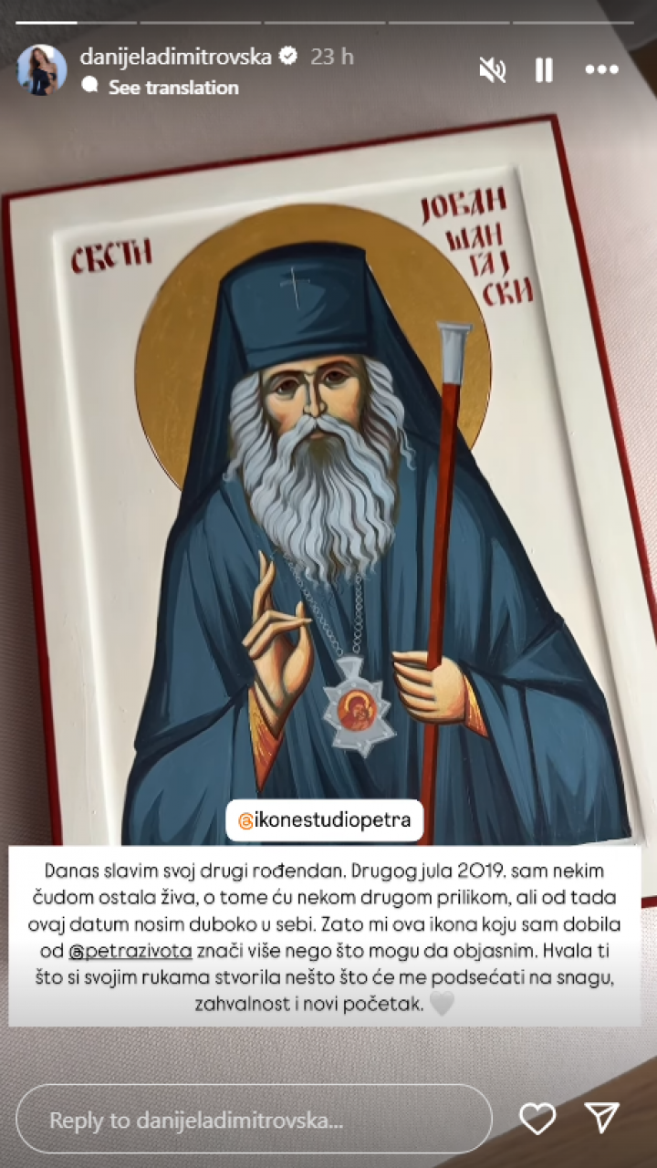 – Slavim svoj drugi rođendan. Tog dana sam nekim čudom ostala živa. O tome ću govoriti nekom drugom prilikom, ali ovaj datum nosim duboko u sebi – napisala je Danijela, uz fotografiju ikone Svetog Jovana Šangajskog, koju je dobila na poklon.