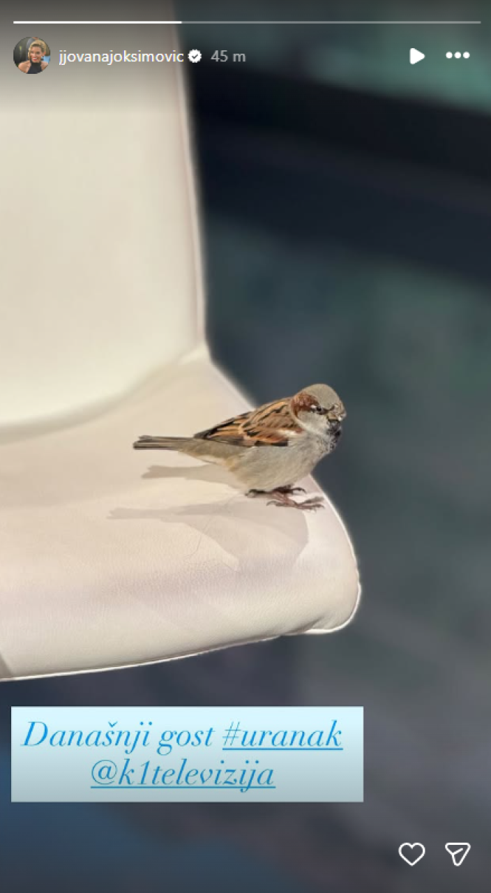 Jovana je uslikala ptičicu koja je sletela na belu stolicu u studiju, a uz fotografiju je šaljivo napisala: