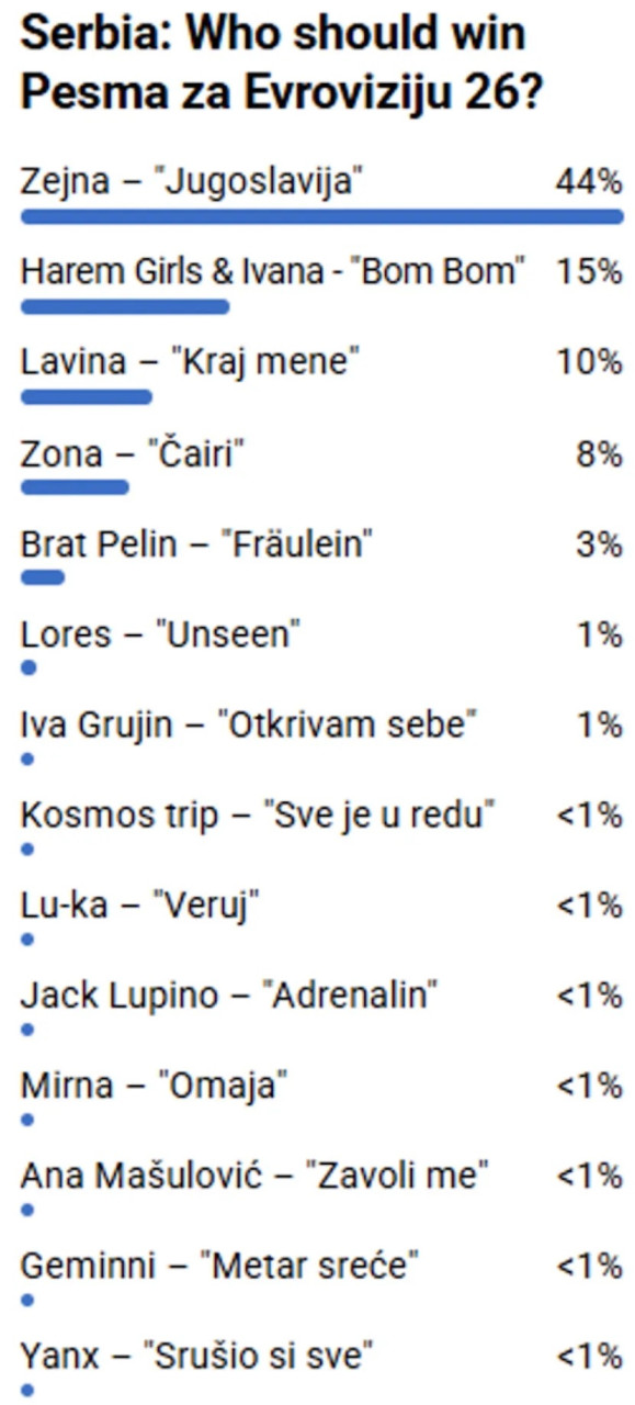 Prema podacima sajta Eurovision World, koji sabira procene kladionica i anketa, najveće šanse za pobedu trenutno ima Zejna Murkić sa pesmom „Jugoslavija“. Kladionice joj daju čak 44% šanse da će upravo ona predstavljati Srbiju na Evroviziji 2026.