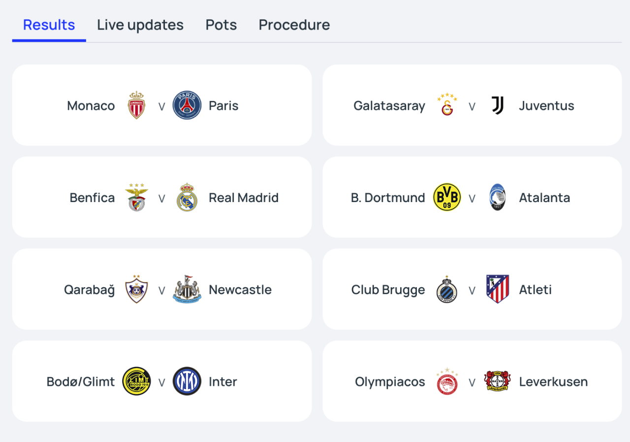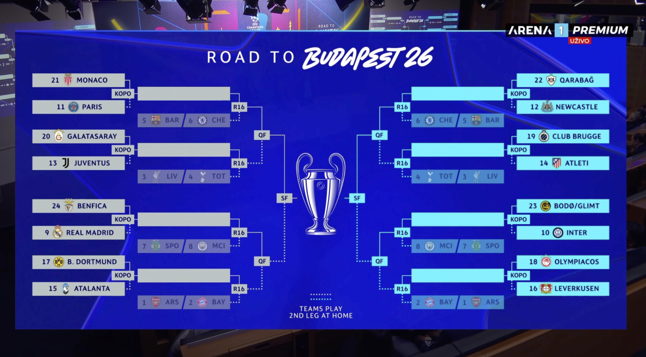 Direktan plasman u osminu finala obezbedilo je osam prvoplasiranih klubova posle grupne faze. To su, redosledom na tabeli, Arsenal, Bajern, Liverpul, Totenhem, Barselona, Čelsi, Sporting i Mančester Siti. Žreb za osminu finala, četvrtfinale i polufinale biće održan 27. februara.