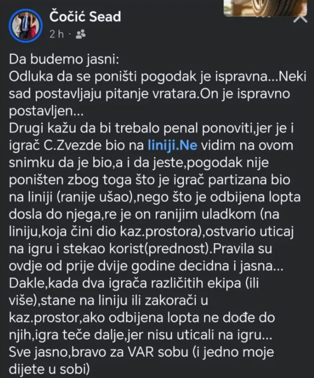 Pravila su ovde od pre dve godine decidna i jasna... Dakle, kada dva igrača različitih ekipa (ili više) stanu na liniju ili zakorače u kazneni prostor, ako odbijena lopta ne dođe do njih, igra teče dalje, jer nisu uticali na igru... Sve jasno, bravo za VAR sobu (i jedno moje dete u sobi) – napisao je Sead Čočić na Fejsbuku, koji je evidentno obučio nekog od arbitara u VAR sobi.