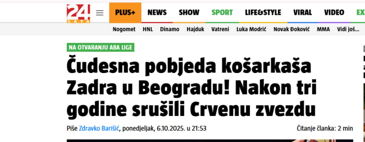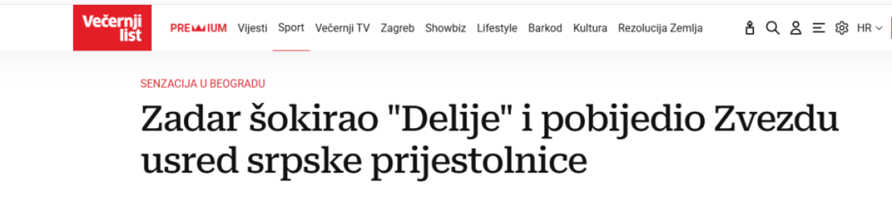 "Verovali ili ne, Zadrani su usred Beograda pobedili evroligaša Crvenu Zvezdu (85:79). Vodili su hrvatski gosti veći deo utakmice a samo je poslednja četvrtina pripala beogradskim domaćinima ali bilo je to kasno buđenje".
