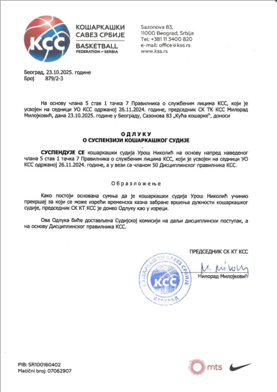 Kako postoji osnovana sumnja da je košarkaški sudija Uroš Nikolić učinio prekršaj za koji se može izreći vremenska kazna zabrane vršenja dužnosti košarkaškog sudije, predsednik SK KT KSS je doneo Odluku kao u izreci.