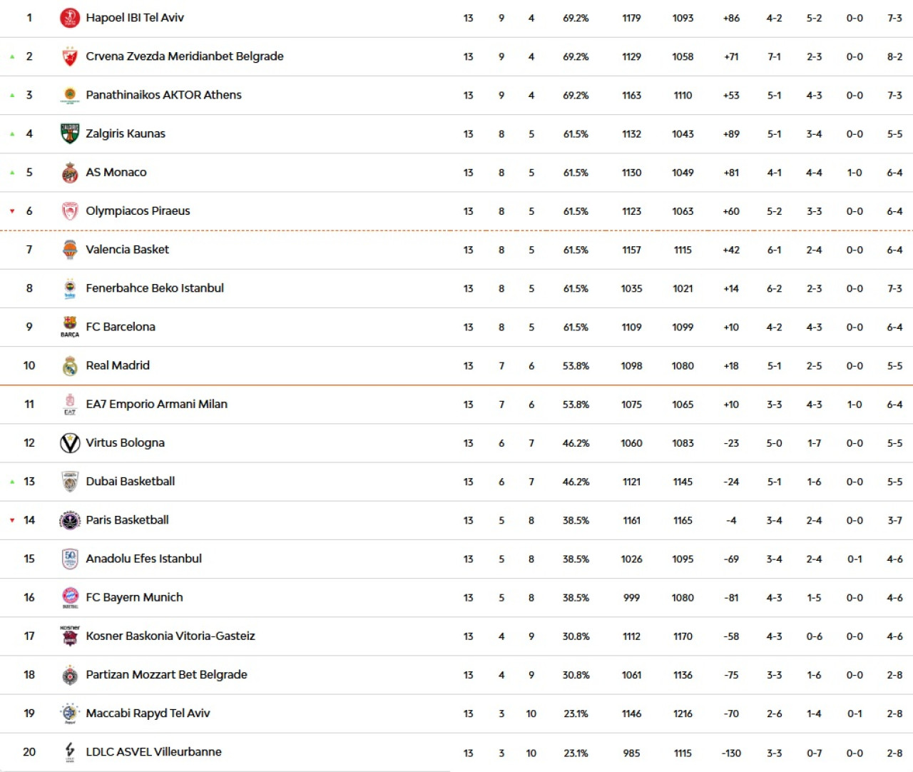 Ovako izgleda tabela Evrolige nakon 13. kola.