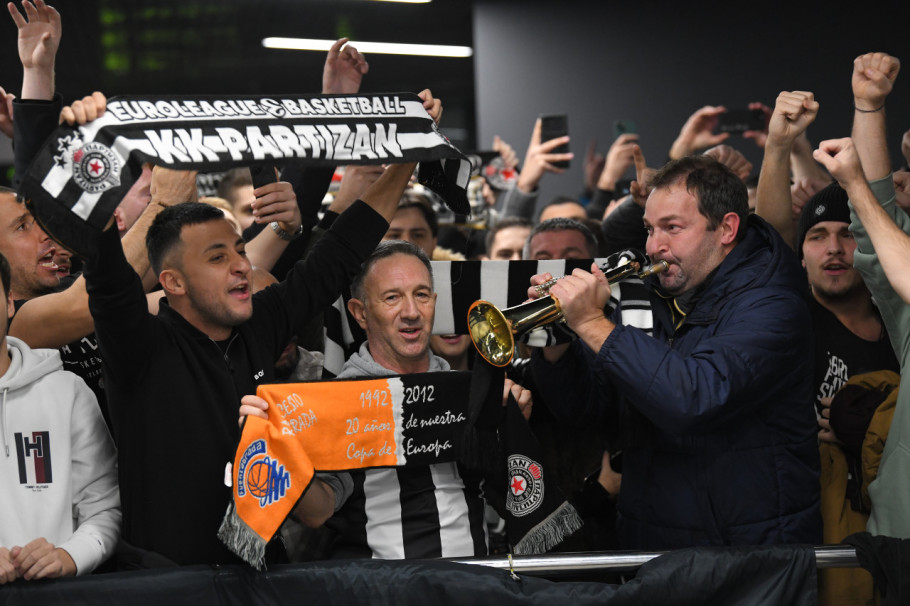 Željko Obradović je oko 18.30 uz pomoć obezbeđenja uspeo da se probije kroz masu navijača, koji su gromoglasno skandirali da ostane trener Partizana. Na izrazu njegovog lica videlo se da mu nije svejedeno. Usledila je i bakljada, uz frenetičnu podršku navijača sa željom da trofejni trener ostane u Srbiji i nastavi da vodi crno-bele.