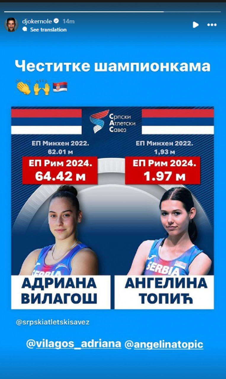 Obe naše atletičarke gledaćemo na Olimpijskim igrama u Parizu. Ovaj veliki uspeh sa razlogom nije prošao nezapaženo, pa su tako devojke dobile pohvale od mnogih sportista, a sada im je čestitao i najbolji teniser sveta Novak Đoković.