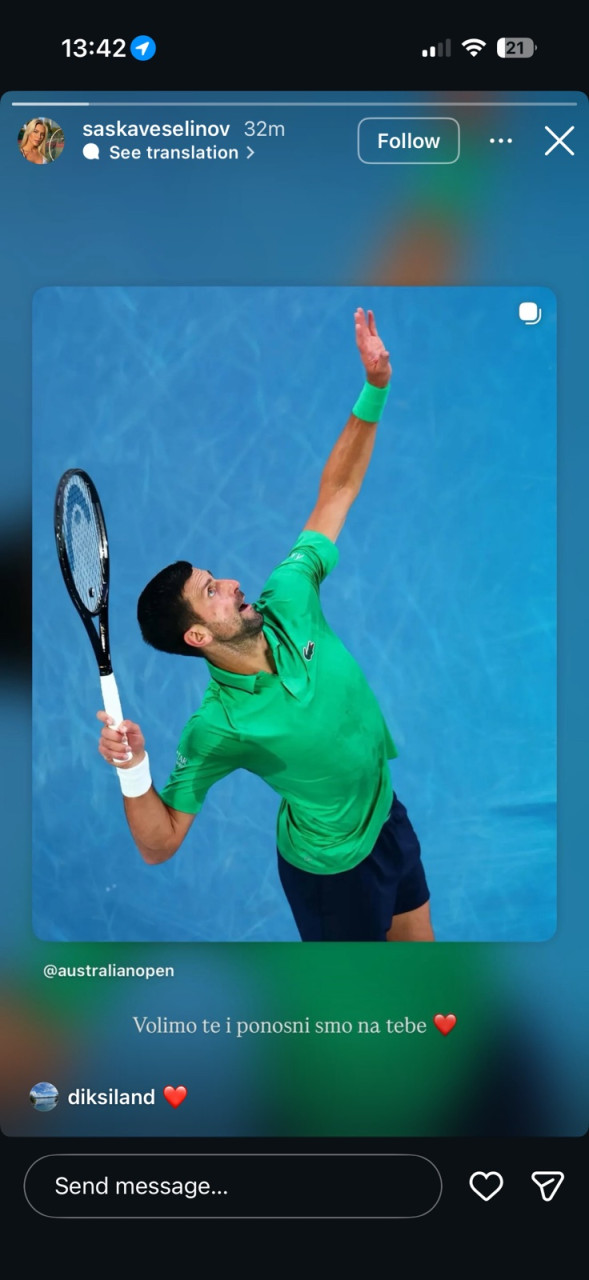 Naime, Saška je objavila Novakovu sliku sa terena iz Rod Lejver arene i u opisu je istakla koliko su svi ponosni na njega.
