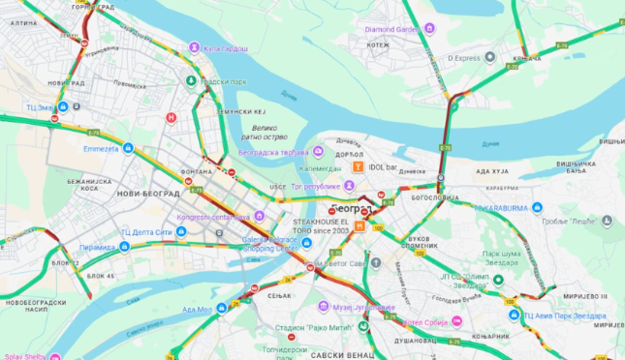 Na Brankovom mostu saobraćaj je gust u smeru ka centru, a zastoj počinje još od TC „Ušće“. Gužve su i na Pančevačkom mostu, takođe ka gradu, kao i na Mostu na Adi u pravcu Dedinja.