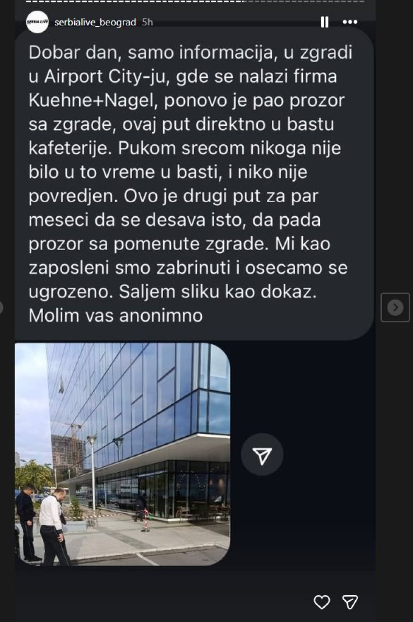 - Dobar dan, samo informacija – u zgradi u Airport City-ju, gde se nalazi firma Kuehne+Nagel, ponovo je pao prozor sa zgrade, ovaj put direktno u baštu Kafeterije. Pukom srećom nikoga nije bilo u to vreme u bašti i niko nije povređen. Ovo je drugi put za par meseci da se dešava isto. Mi kao zaposleni smo zabrinuti i osećamo se ugroženo. Šaljem sliku kao dokaz. Molim vas anonimno - navodi uznemireni zaposleni u poruci objavljenoj na Instagram stranici Serbia Live Beograd.