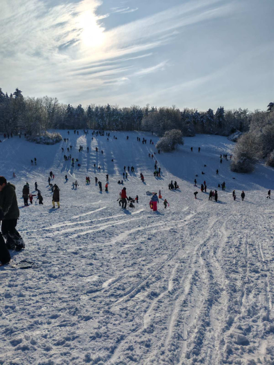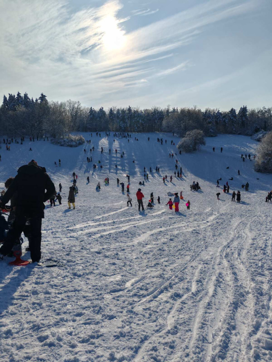 Mnogo ljudi, od mališana do odraslih, pohitalo je na padinu kako bi uživalo u snegu.
