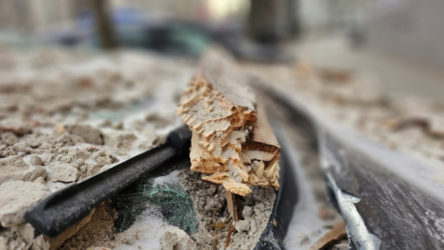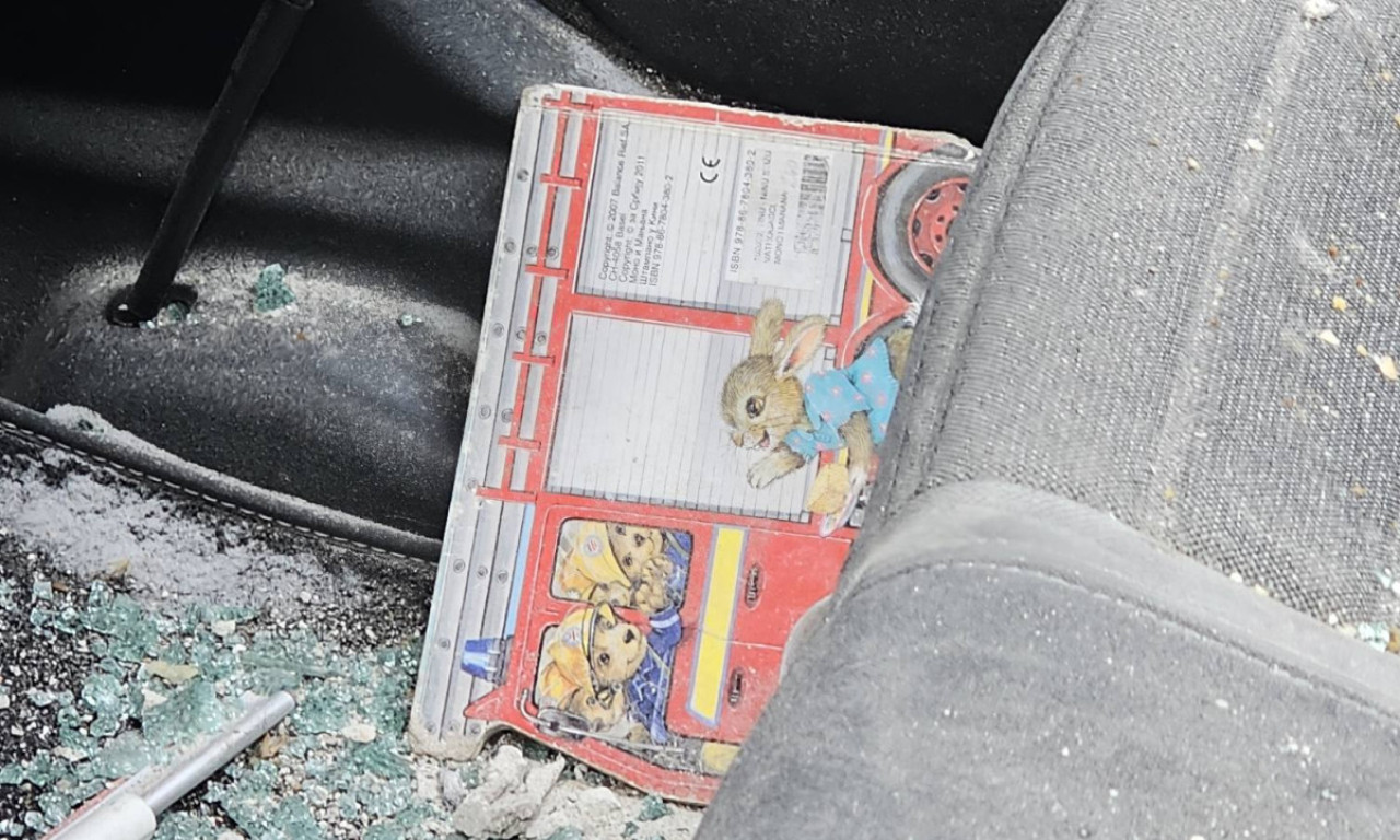 Ispred zgrade su razlupana parkirana kola, a jedan detalj posebno upada u oči – knjiga za decu zatrpana staklom, koja podseća koliko je bilo blizu velike tragedije.