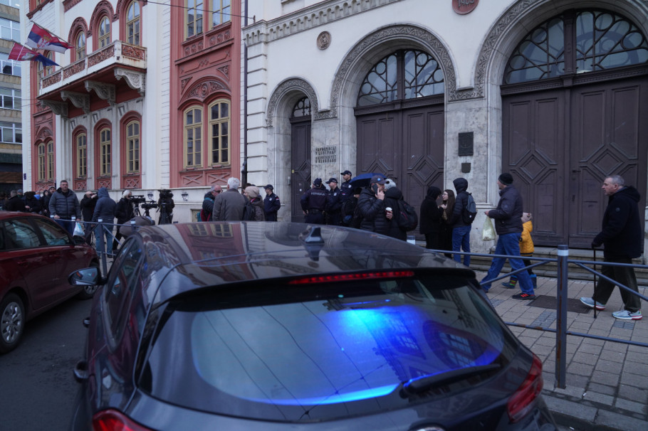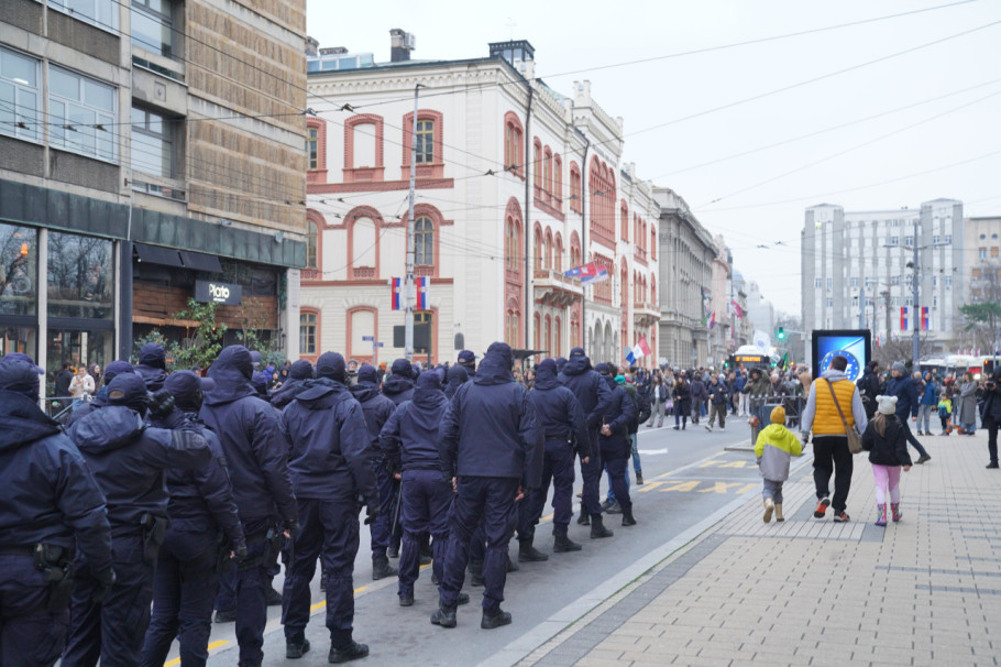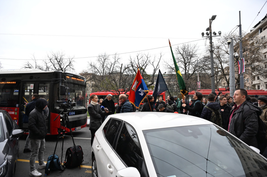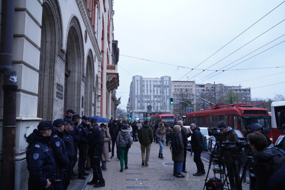 Na Studentskom trgu danas posle podne blokiran je saobraćaj zbog protesta manje grupe građana koji su se okupili ispred Rektorata Univerziteta u Beogradu, a posle ulaska pripadnika Uprave kriminalističke policije u tu zgradu.