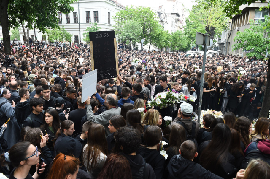 Kako pišu mediji prisutni su većinom učenici, ali i profesori, porodice nastradalih, ali i građani koji su se spontano okupili da zapale sveće i ostave cveće nastradale učenike. Svako nosi po 9 sveća. Okupljeni građani sa suzama u očima opraštaju se od učenika i portira škole koji su stradali u nezapamćenom masakru.