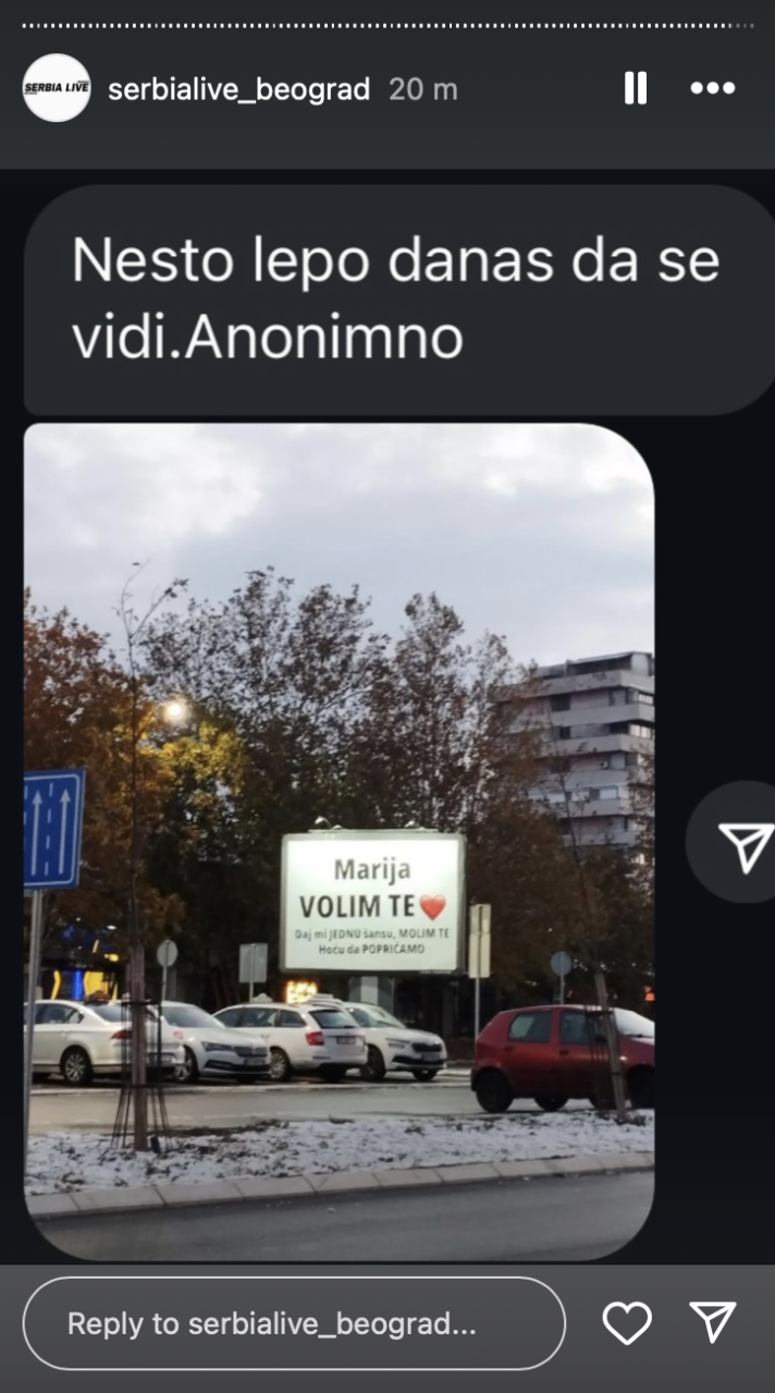- Marija, volim te! Daj mi jednu šansu, molim te, hoću da popričamo - napisao je momak u poruci na bilbordu uz koju je nacrtano i srce.