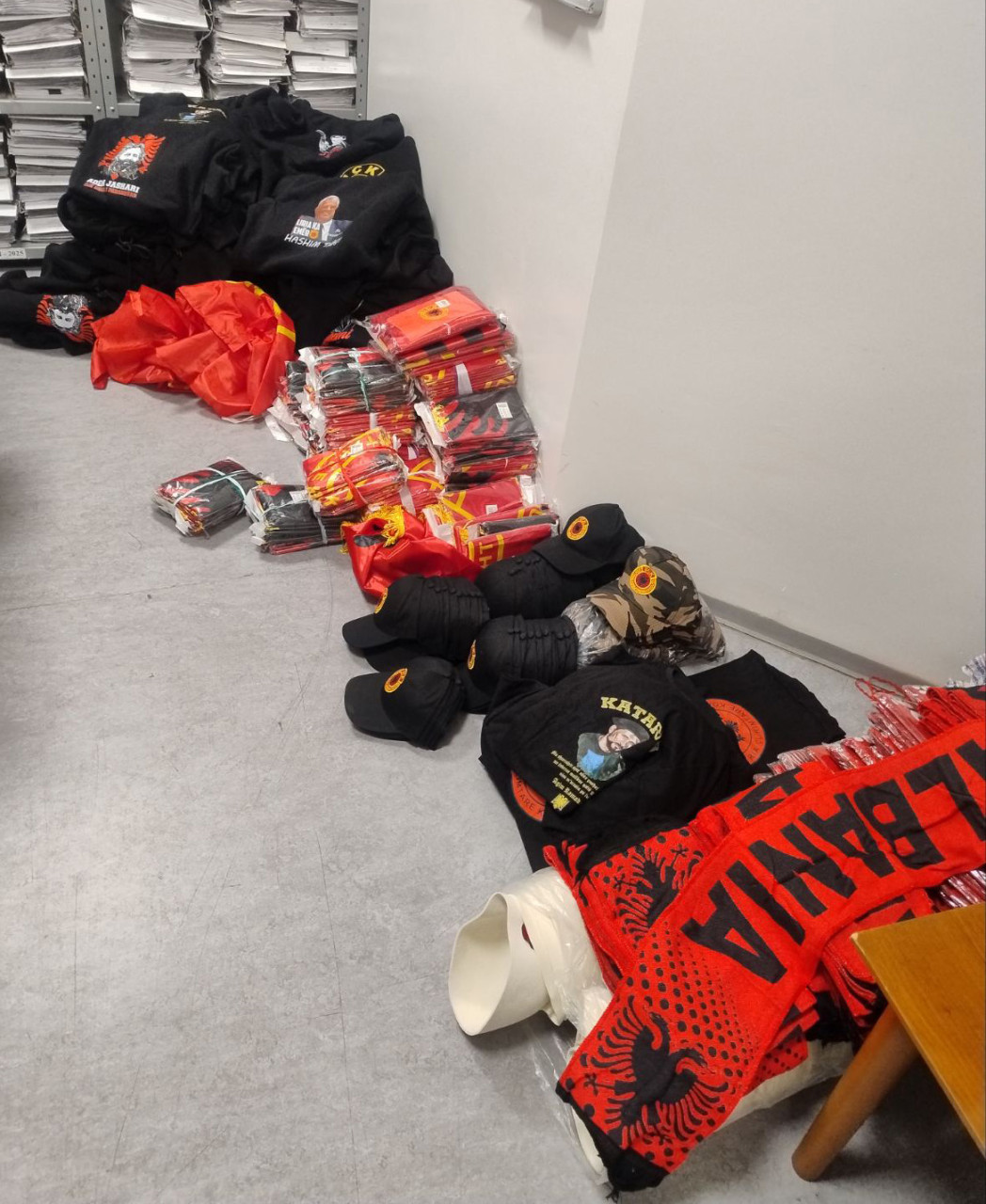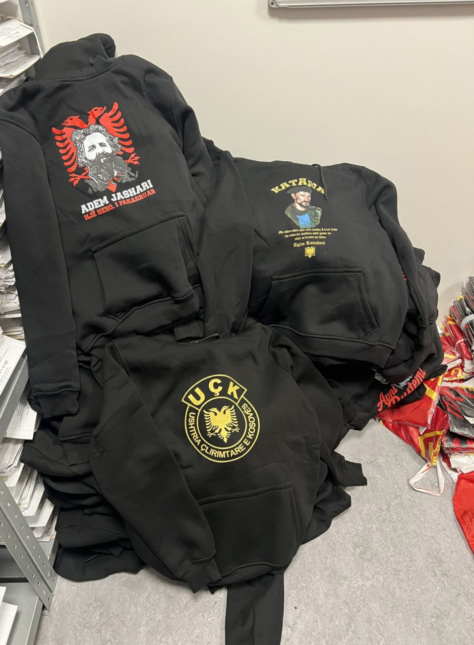 Policija je na administrativnom prelazu Merdare pregledom kombija marke „mercedes“, kojim je iz pravca AP KiM upravljao osumnjičeni, pronašla pet torbi u kojima su se nalazile 22 majice, 244 zastave i 86 kačketa sa natpisom UČK, 65 dukserica sa likom Agima Ramadanija, 58 šalova sa grbom Albanije, kao i 92 kape „ćelepoši“.