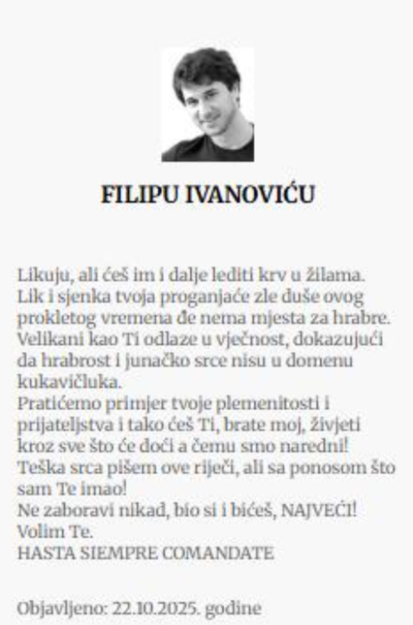 - Likuju, ali ćeš im i dalje lediti krv u žilama. Lik i senka tvoja proganjaće zle duše ovog prokletog vremena gde nema mesta za hrabre. Velikani kao ti odlaze u večnost, dokazujući da hrabrost i junačko srce nisu u domenu kukavičluka. Pratićemo primer tvoje plemenitosti i prijateljstva i tako ćeš ti, brate moj, živeti kroz sve što će doći, a čemu smo naredni. Teška srca pišem ove reči, ali sa ponosom što sam te imao! Ne zaboravi nikad, bio si i bićeš, najveći. Volim te - piše u nepotpisanoj čitulji ispod čega je dodato velikim slovima "Hasta siempre comandante" (Zbogom zauvek komandante).