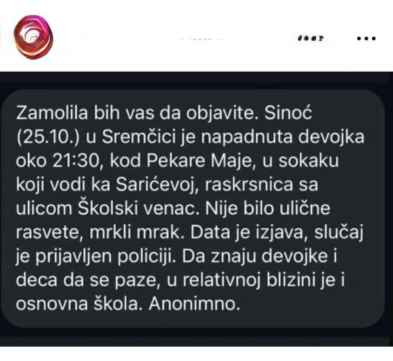 Sinoć je, u Sremčici, oko 21.30 časova napadnuta devojka u blizini "Pekare Maja", u sokaku koji vodi ka Sarićevoj ulici, na raskrsnici sa ulicom Školski venac.