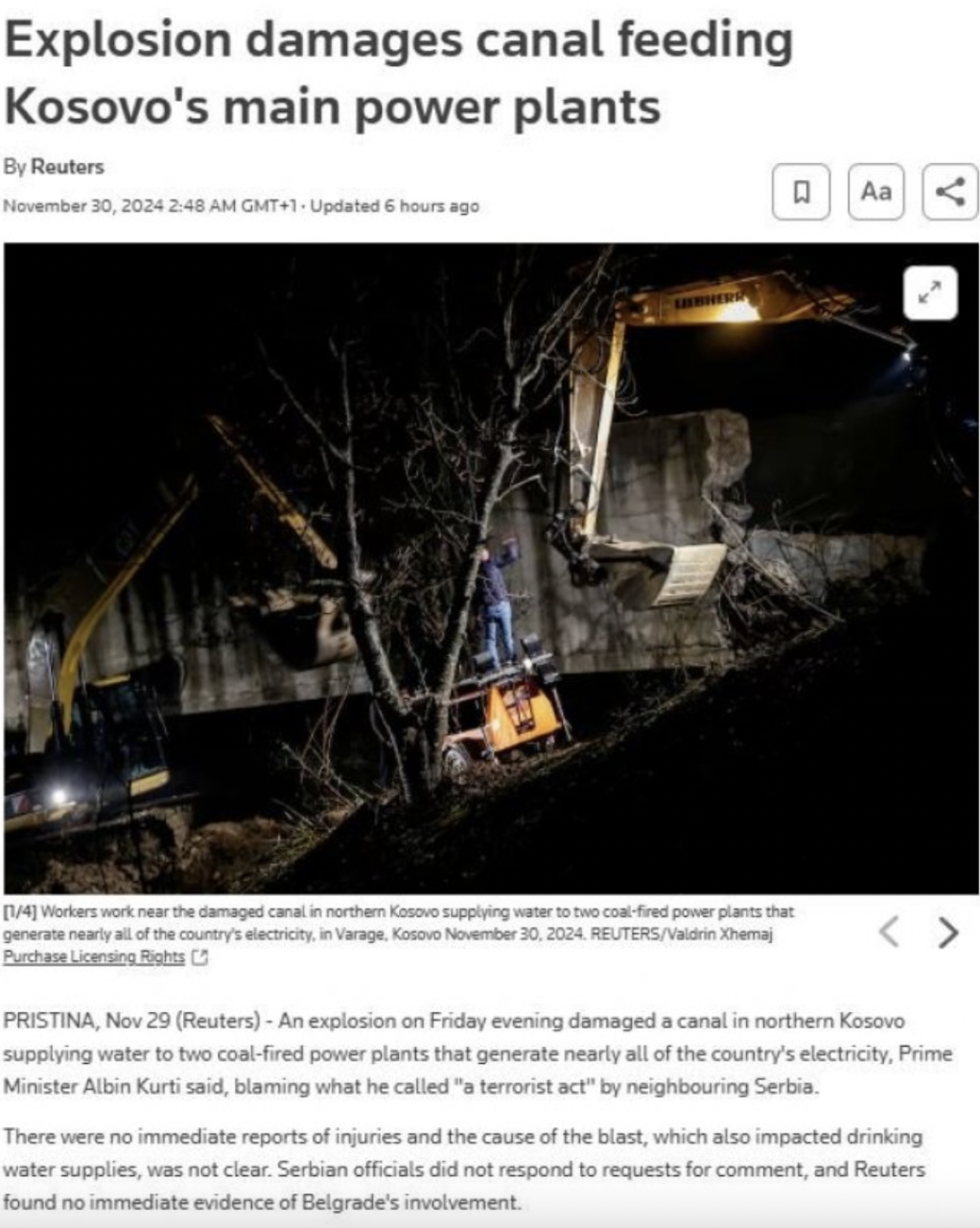 Rojters ovu ocenu daje odgovarajući na tvrdnju premijera privremenih prištinskih institucija Aljbina Kurtija koji je eksploziju još sinoć, neposredno nakon što se dogodila, okarakterisao kao "teroristički akt".