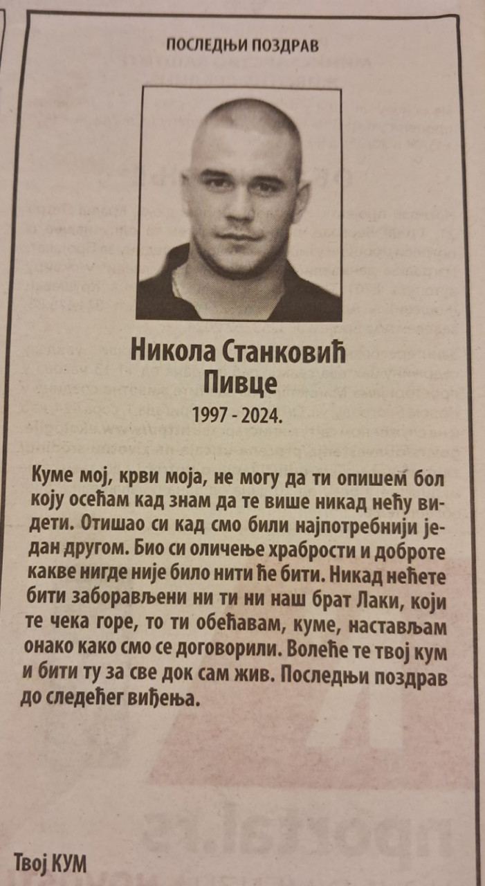 Nikola Stanković Pivce, podsetimo, ubijen je 21. decembra oko 4.20 sati ujutro u svojoj kući u Kaluđerici. Likvidiran je sa dva hica u glavu i jednim u vrat dok je spavao pored verenice T. D. (25) koja je ranjena u šaku.