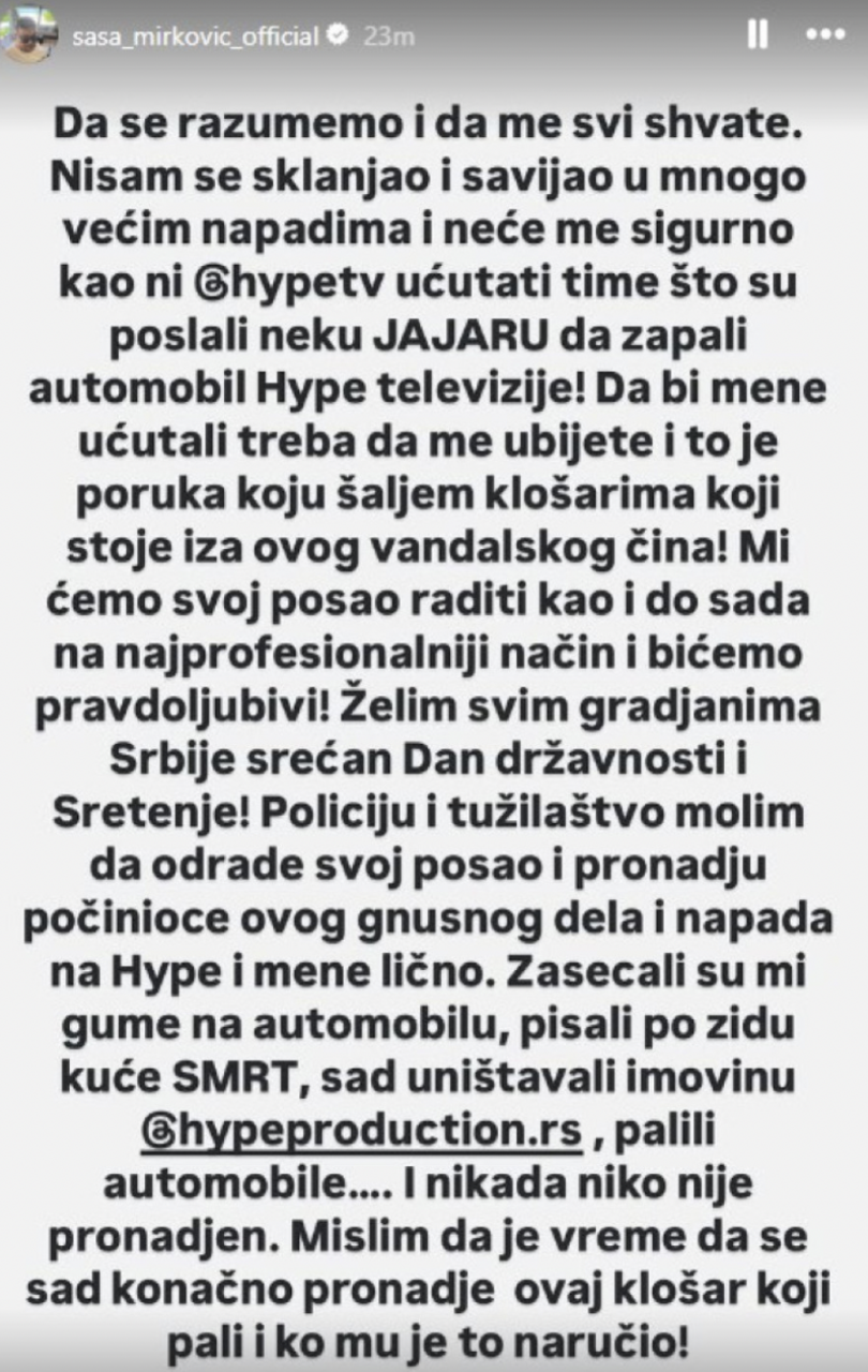 - Policiju i tužilaštvo molim da odrade svoj posao i pronađu počinioce ovog gnusnog dela i napada na "Hype" i mene lično. Zasecali su mi gume na automobilu, pisali po zidu kuće smrt, sad uništavaju imovinu "Hype" produkcije, palili automobile... I nikada niko nije pronađen. Mislim da je vreme da se sad konačno pronađe ovaj klošar koji pali i ko mu je to naručio - napisao je Saša Mirković na svom Instagram profilu.