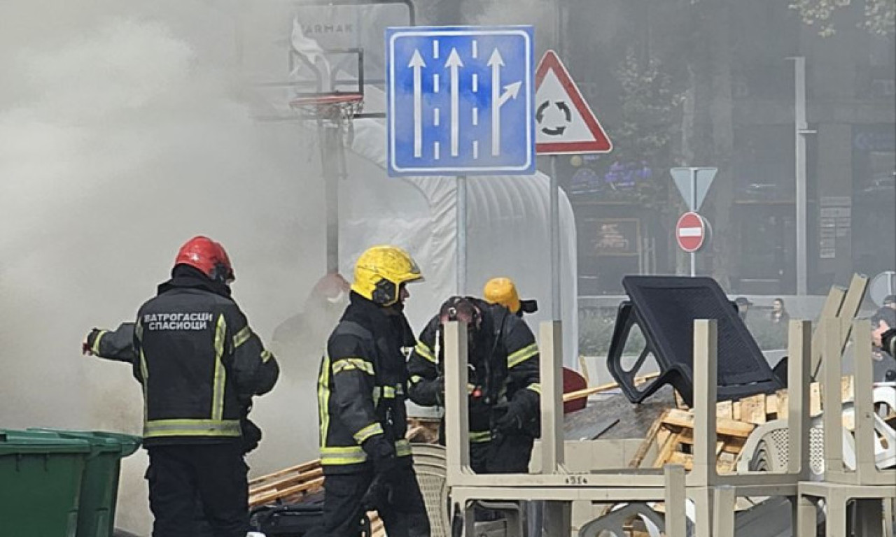 Nakon što se oštećeni M.B. nakon zadobijanja povreda zateturao ispred ulaza u šator i udaljio, osumnjičeni je ispalio više projektila, a potom i izazvao požar tako što je benzinom koji je poneo sa sobom u plastičnoj kantici - kanisteru, polio unutrašnjost šatora u kome su se nalazile različite stvari i garderoba i uz pomoć otvorenog plamena isti zapalio. Plamen se potom sa ovog šatora proširio i na susedne šatore i predmete koji su se nalazili u njima, usled čega je došlo i do oštećenja vozila marke „Škoda Oktavia“ koje se nalazilo na službenom parkingu ispred Doma Narodne skupštine.