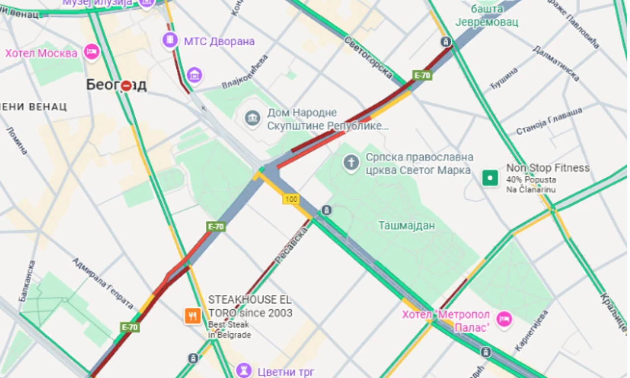 Raskrsnica koja spaja Takovsku ulicu, Kneza Miloša, Bulevar kralja Aleksandra i Trg Nikole Pašića blokirana je za saobraćaj.