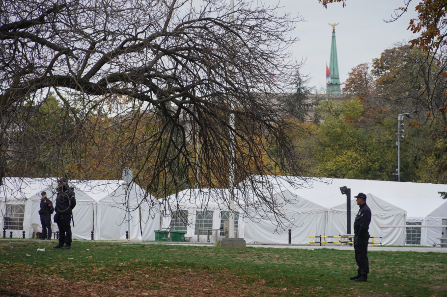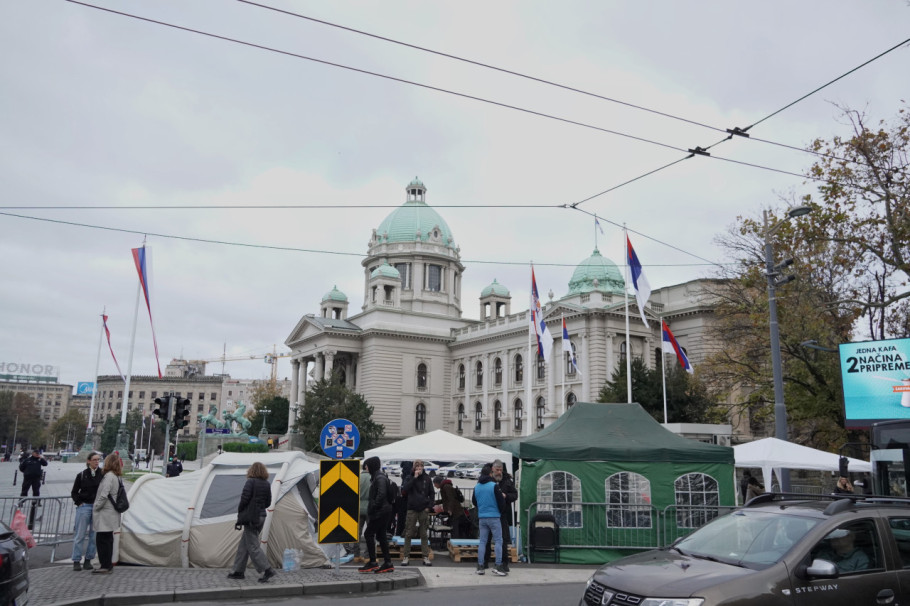 Na uglu Takovske ulice i Bulevara kralja Aleksandra nalazi se šator u kome je Hrka, koja je u nedelju započela štrajk glađu, a čiji je sin stradao u padu nadstrešnice na Železničkoj stanici u Novom Sadu.