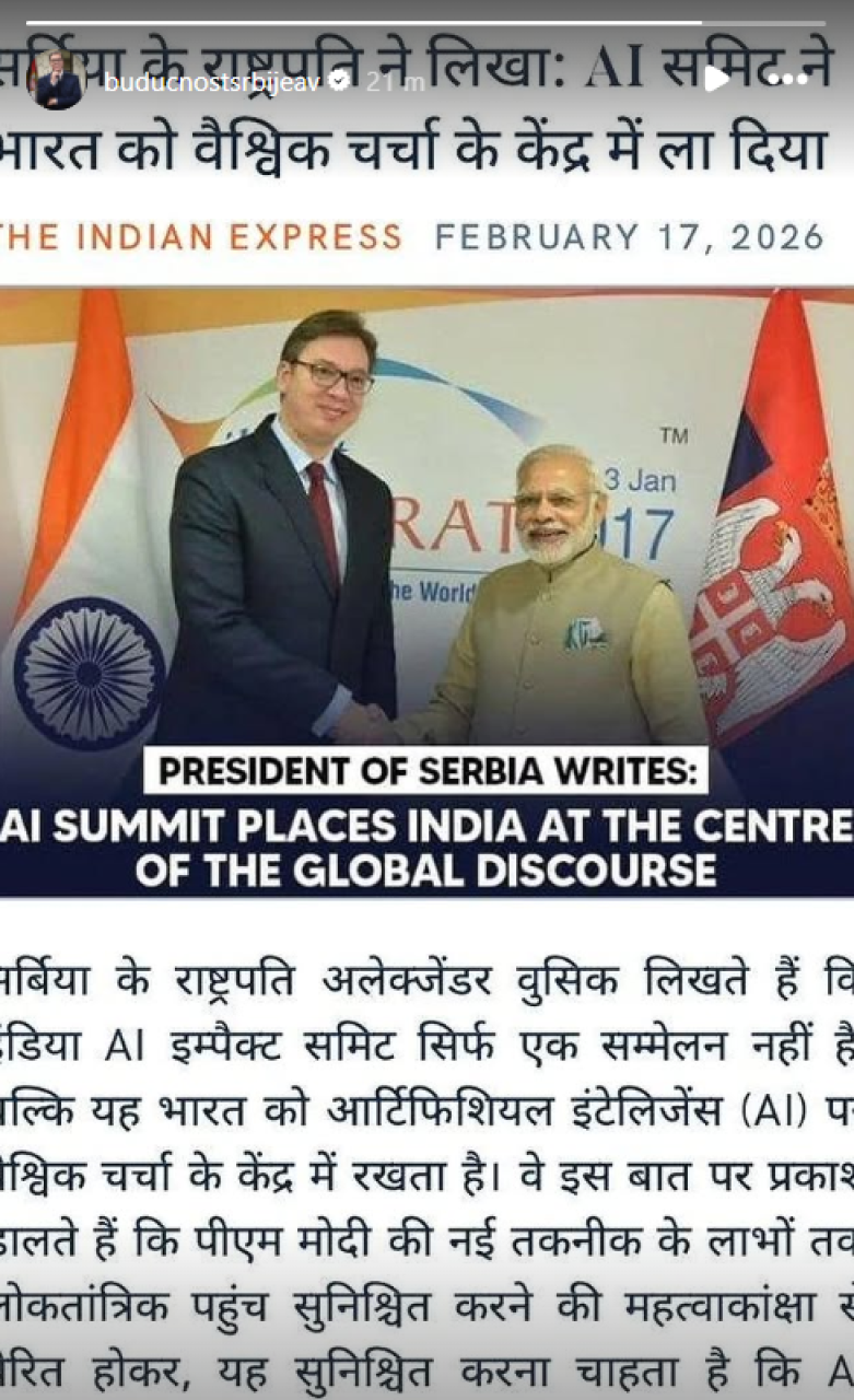 Vučić je u tekstu pisao o odnosima dve zemlje, ali i o Samitu o uticaju veštačke inteligencije koji se održava u Nju Delhiju, pristupu Indije AI.