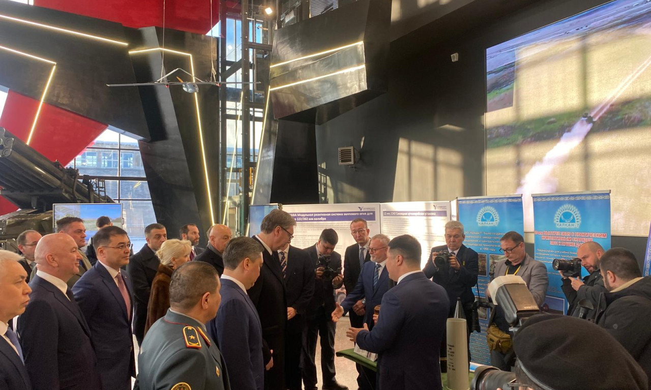 Predsednik Srbije Aleksandar Vučić, koji boravi u zvaničnoj poseti Kazahstanu na poziv kazahstanskog predsednika Kasim-Žomart Tokajeva, sa srpskom delegacijom obilazi u Astani vojnu izložbu kazahstanske kompanije namenske industrije.