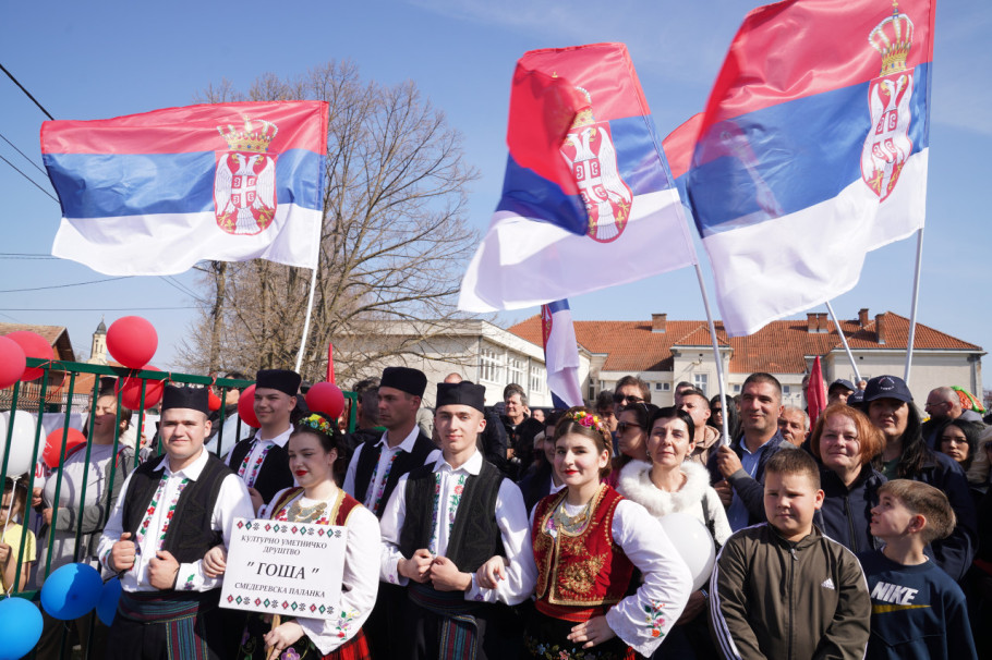 Predsednika je dočekao veliki broj meštana, koji nose srpske zastave, a čuju se i srpske pesme.