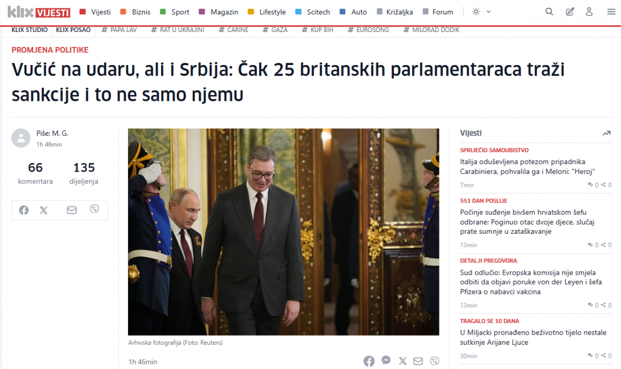"Vučić na udaru, ali i Srbija: Čak 25 britanskih parlamentaraca traži sankcije i to ne samo njemu", napisali su lažni naslov novinari portala Klix.ba.