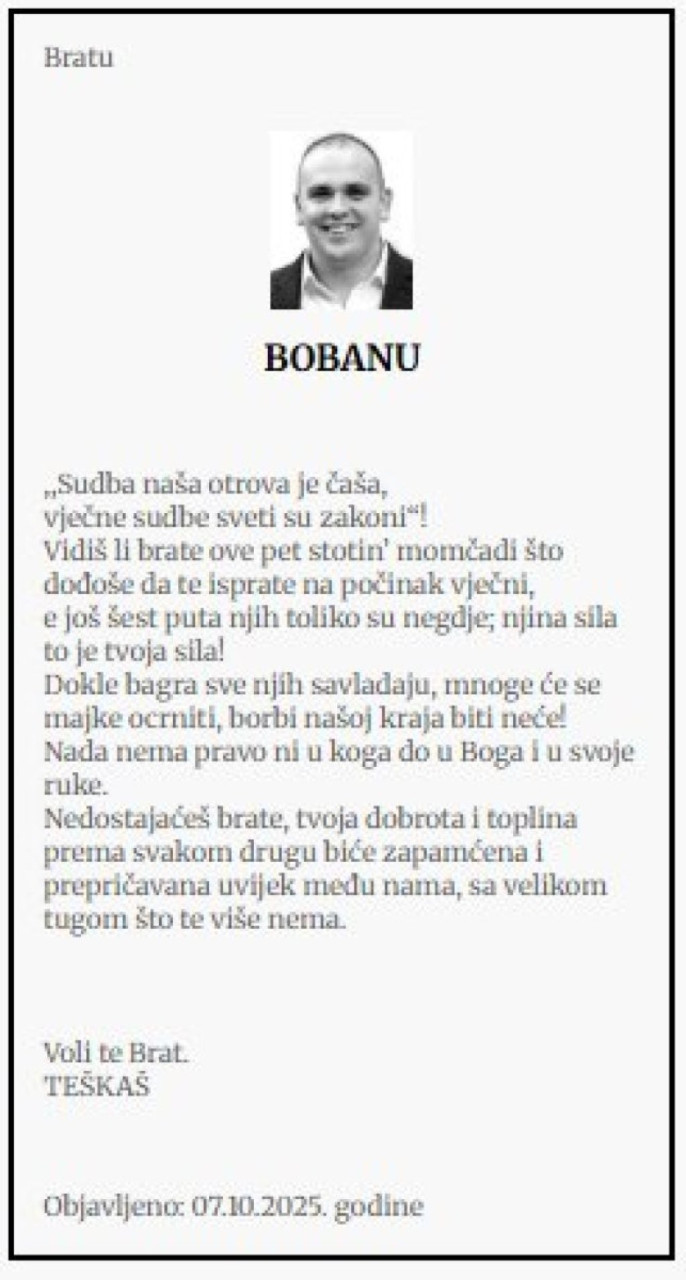 - Bratu Bobanu, "sudba naša otrova je čaša, večne sudbe sveti su zakoni"! Vidiš li brate ove pet stotin’ momčadi što dođoše da te isprate na počinak večni, e još šest puta njih toliko su negde; njina sila to je tvoja sila! Dokle bagra sve njih savladaju, mnoge će se majke ocrniti, borbi našoj kraja biti neće! Nada nema pravo ni u koga do u Boga i u svoje ruke. Nedostajaćeš brate, tvoja dobrota i toplina prema svakom drugu biće zapamćena i prepričavana uvek među nama, sa velikom tugom što te više nema. Voli te brat, Teškaš - piše u misterioznoj čitulji koja je osvanula u jednim crnogorskim novinama.