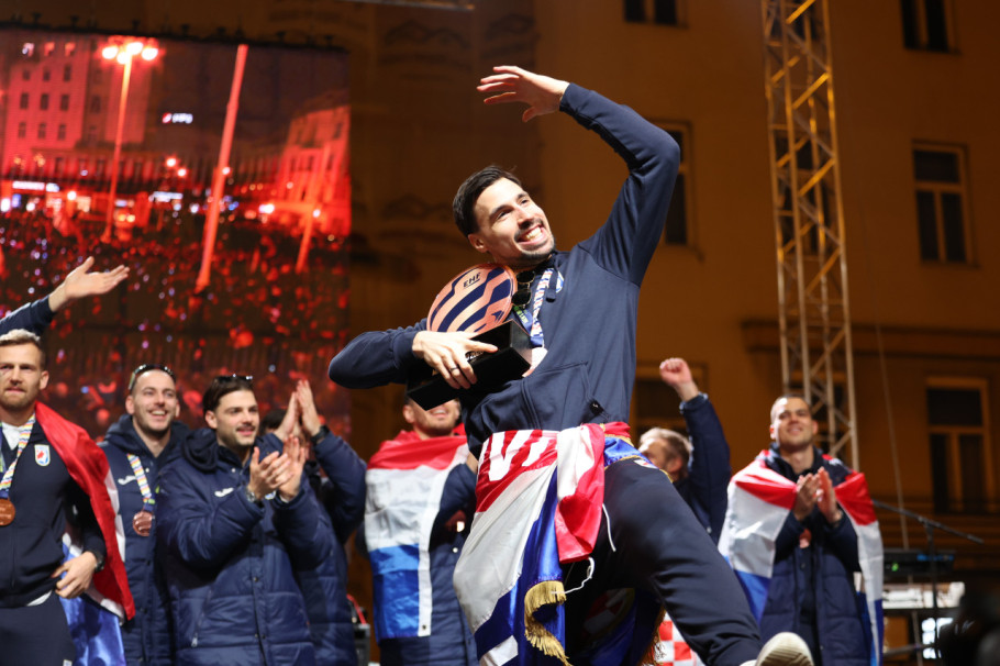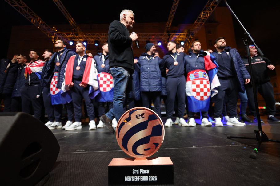Marko Perković Tompson je, pozdravljen skandiranjem „Marko, Marko“, rukometašima čestitao na osvajanju bronzane medalje na EP u rukometu i izrazio zadovoljstvo što su pevali njegove pesme.