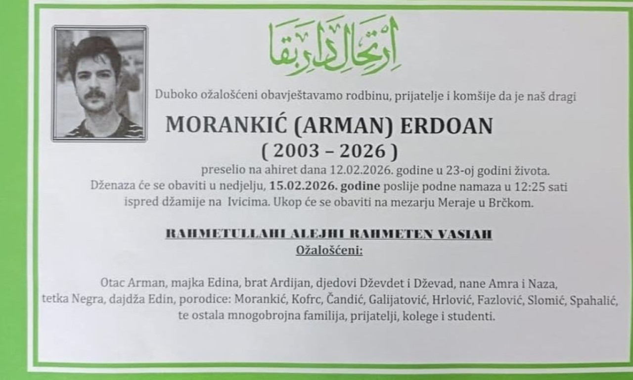 Sahrana će se obaviti na mezarju Meraje u Brčkom, gde će porodica, prijatelji i sugrađani uputiti poslednji pozdrav nastradalom mladiću.