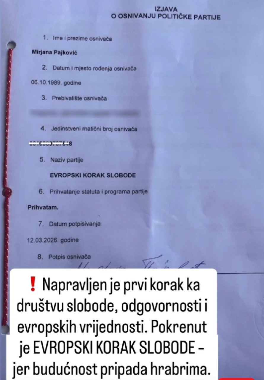 Mirjana Pajković, bivša funkcionerka Ministarstva ljudskih i manjinskih prava u Crnoj Gori, pokrenula je zvaničan postupak za osnivanje nove partije u Crnoj Gori. Ona je danas na svom nalogu na društvenoj mreži Instagram objavila fotografiju ispunjene izjave o osnivanju partije.
