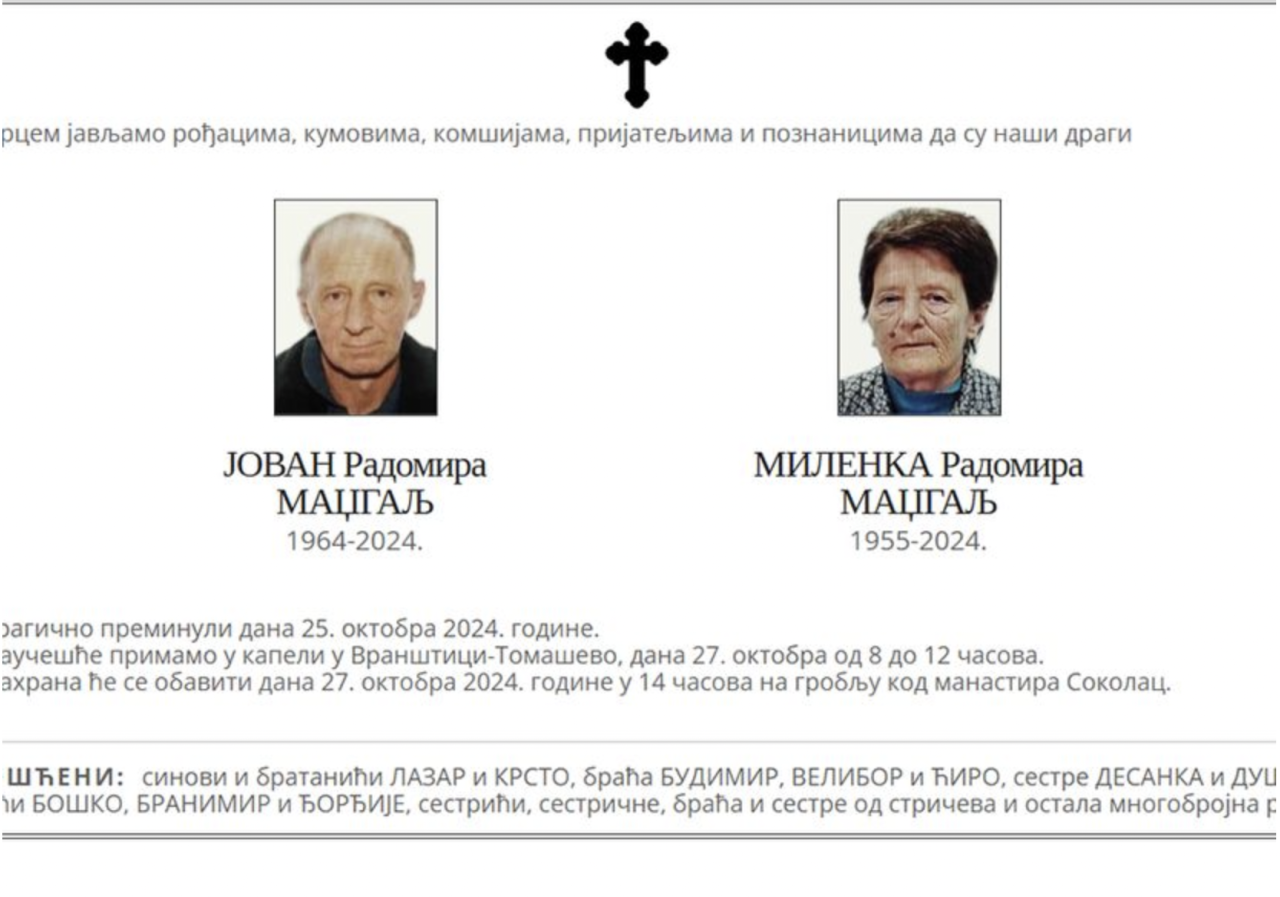 - Tužnim srcem javljamo našim rođacima, kumovima, kompijama, prijateljima i poznanicima da su naši dragi Jovan i Milenka Madžgalj tragično preminuli - reči su kojim je porodica saopštila tužne vesti.