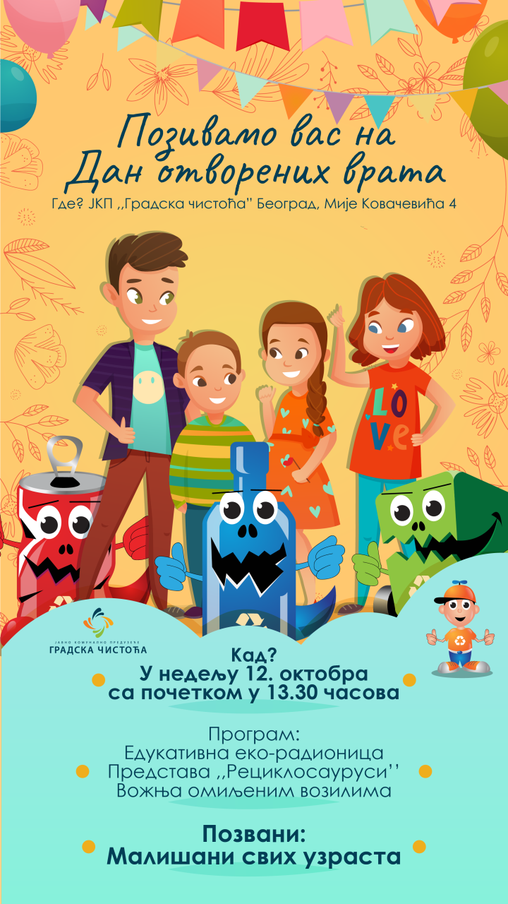 Tokom tradicionalne akcije "Dan otvorenih vrata" mališani će u pratnji svojih roditelja, staratelja, baka i deka, vaspitača i nastavnika moći da iskoriste jedinstvenu priliku da pored vožnje u omiljenim smećarcima vide i kako izgleda vožnja u specijalizovanim vozilima, za vodu i zemlju, popularnim Amfibijama, kako se koriste elektro-čistilice, elektro-trotineti, duvači za lišće, elektro-usisivači, kao i da učestvuju u edukativnim radionicama o reciklaži, a sve to u obezbeđenom krugu preduzeća.