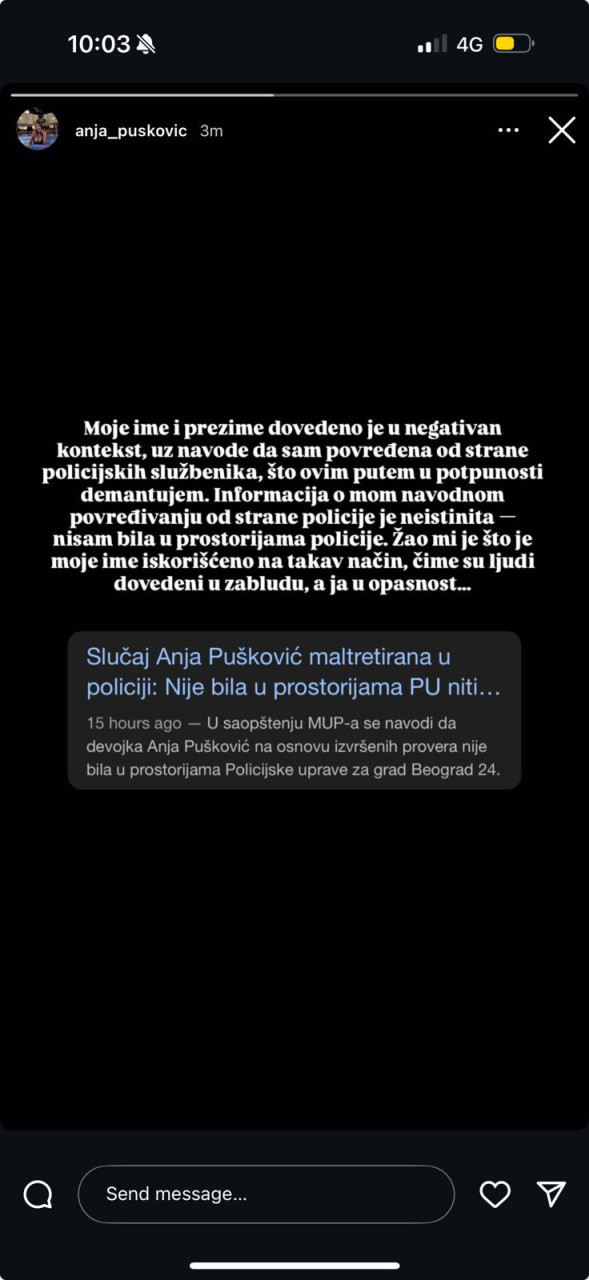 - Moje ime i prezime dovedeno je u negativan kontekst, uz navode da sam povređena od strane policijskih službenika, što ovim putem u potpunosti demantujem. Informacija o mom navodnom povređivanju od strane policije je neistina - nisam bila u prostorijama policije. Žao mi je što je moje ime iskorišćeno na takav način, čime su ljudi dovedeni u zabludu, a ja u opasnost - napisala je Anja na svom storiju.