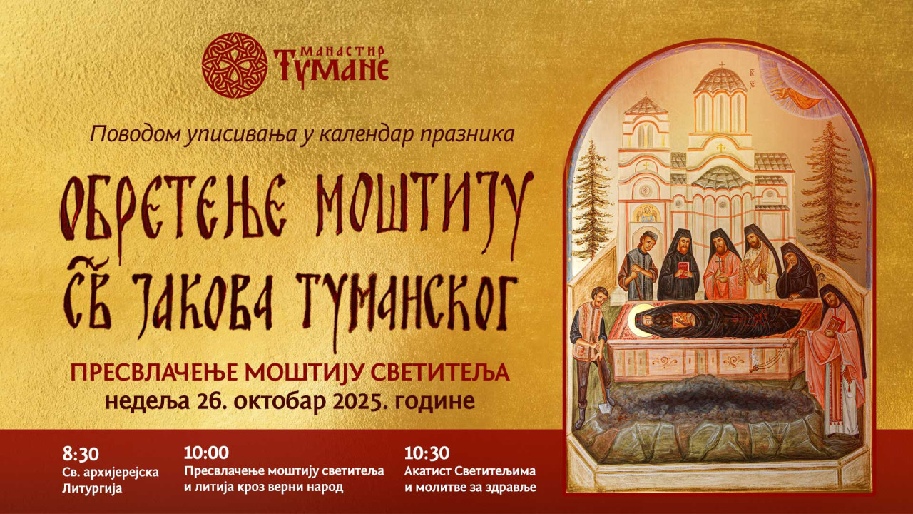 Iguman je sa radošću najavio da će 26. oktobra 2025. godine manastir Tumane svečano proslaviti upisivanje u crkveni kalendar praznika Obretenja moštiju Svetog Jakova Tumanskog. Toga dana biće izvršeno i svečano presvlačenje moštiju svetitelja u novo odjejanje.