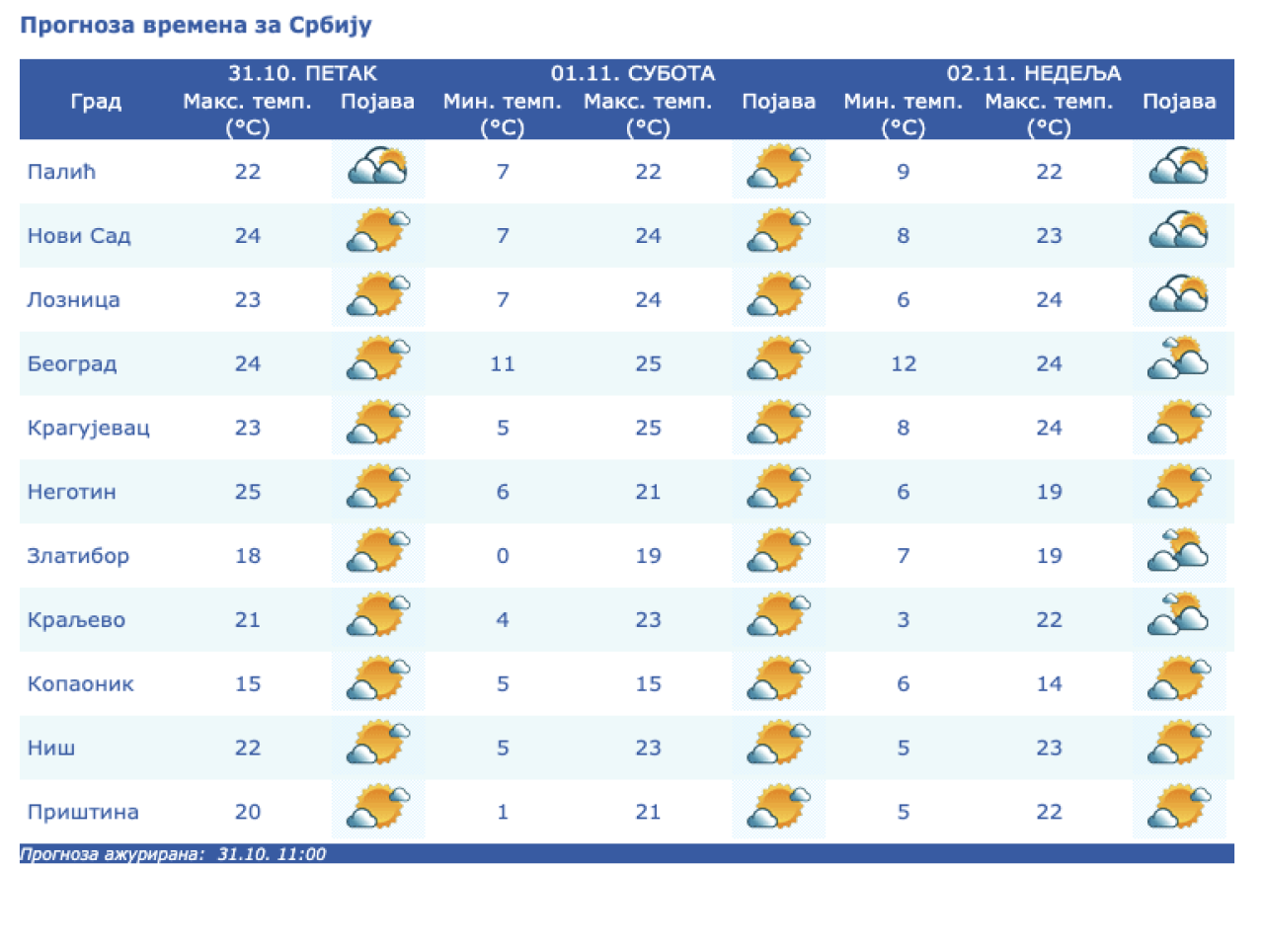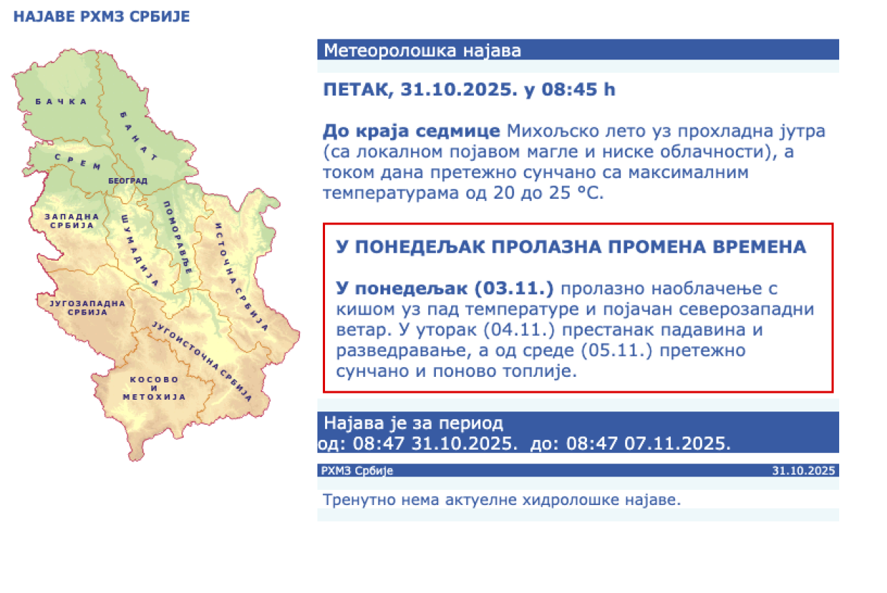 Ponedeljak (3. novembar): Prodor hladnog fronta doneće prolazno naoblačenje sa kišom. Vetar će biti u skretanju na severozapadni i u pojačanju. Temperatura će biti u padu za oko 10 stepeni u odnosu na vikend.