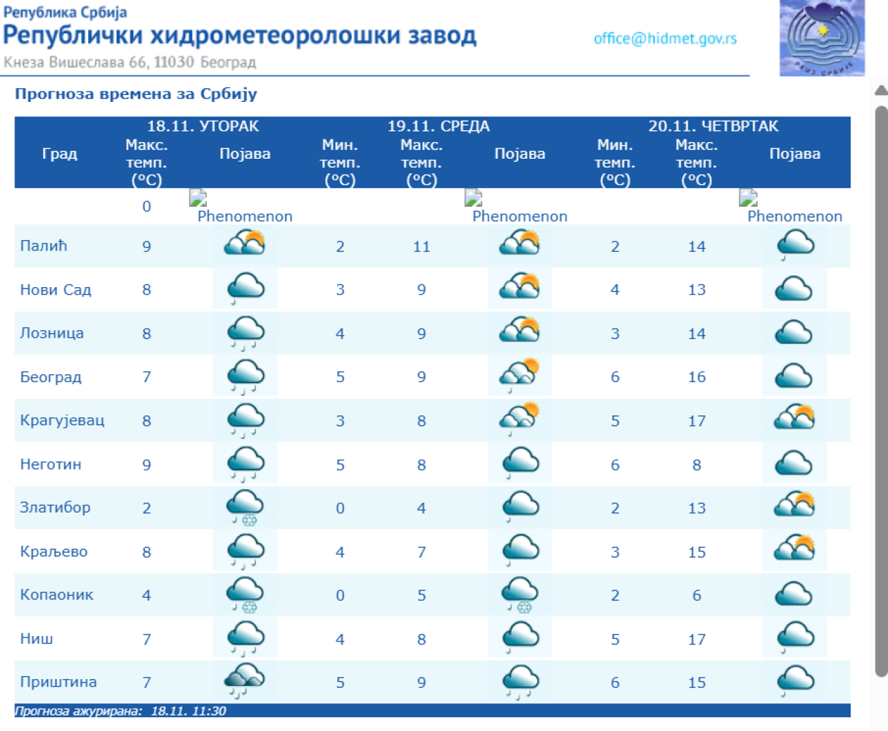 Četvrtak (20.11.) i Petak (21.11.): Umereno do potpuno oblačno, uz osetno otopljenje.