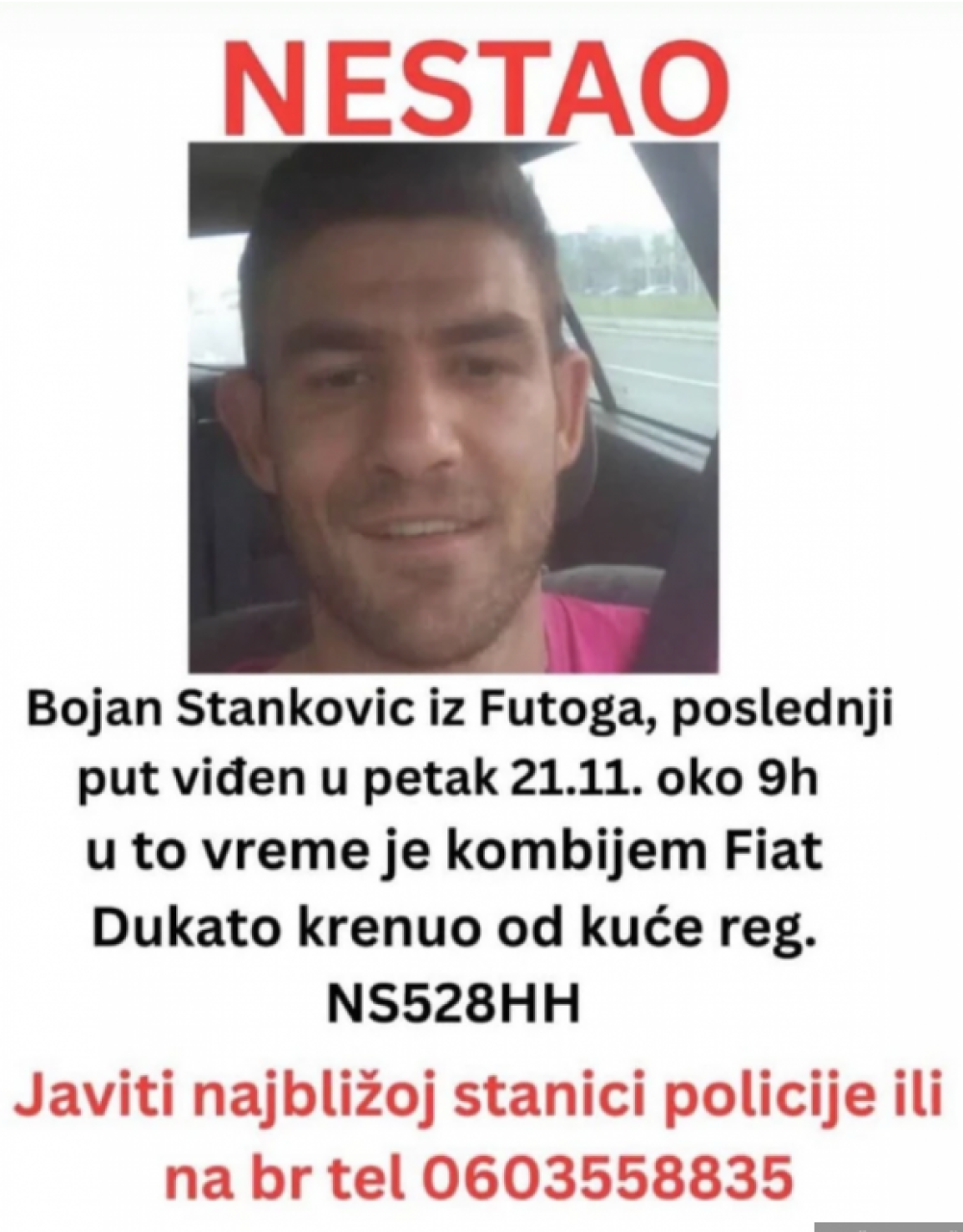 Bojan Stanković iz Futoga nestao je 21. novembra oko 9 časova. On je, kako se navodi, izašao iz kuće i od tada mu se gubi svaki trag.