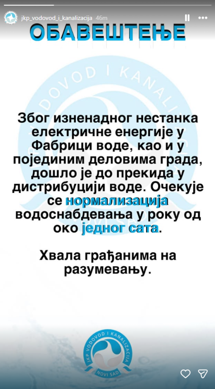 Kako se navodi u saopštenju objavljenom na Instagramu tog preduzeća, normalizacija vodosnabdevanja očekuje su u roku od jednog sata.