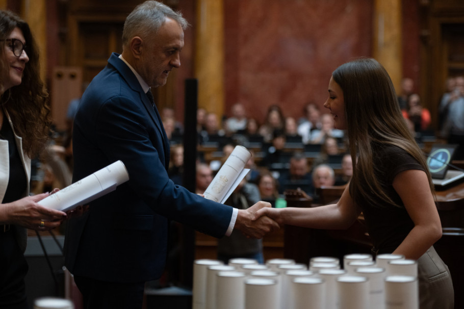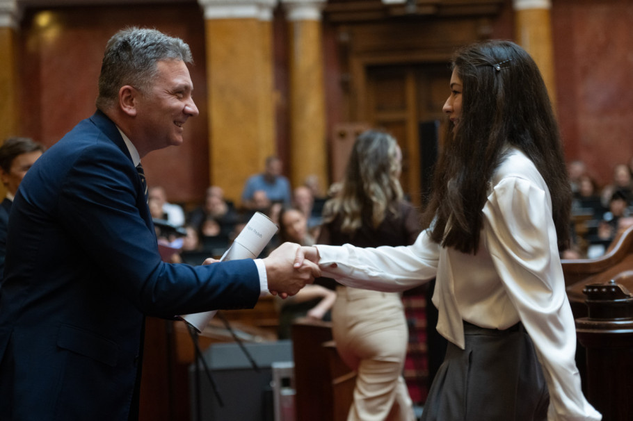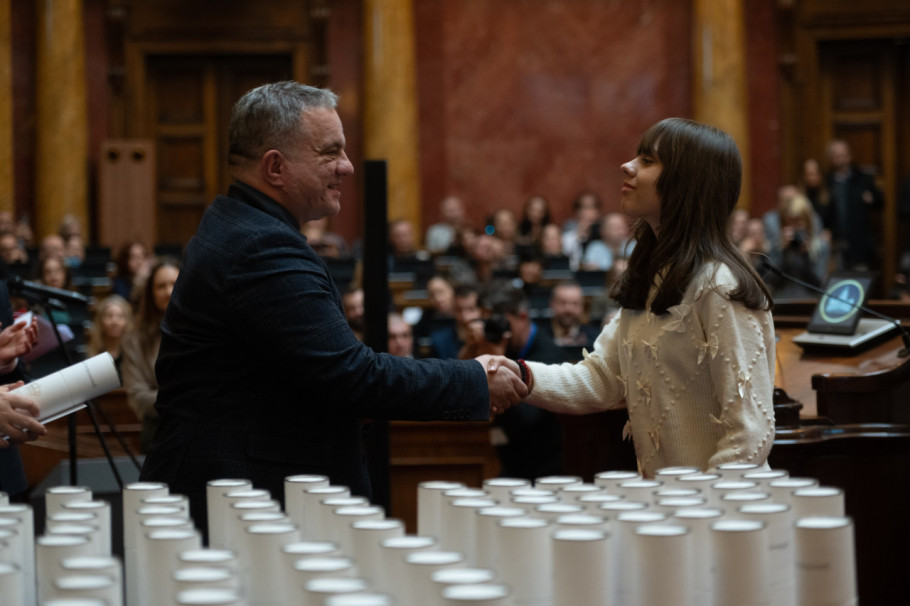 U Skupštini Srbije danas su dodeljene plakete Takmičarima generacije, najboljim učenicima osnovnih škola koji su postigli izuzetne rezultate na republičkim i međunarodnim takmičenjima, a dodeli je prisustvovala i predsednica parlamenta Ana Brnabić.