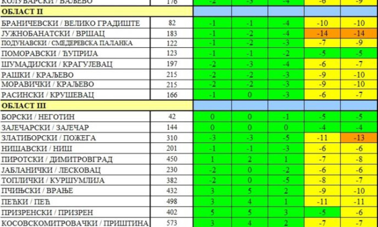 - Prognozirane vrednosti minimalne dnevne temperature vazduha će biti u kategoriji veoma opasne pojave 12. januara u južnobačkom, severnobačkom, zapadnobačkom i zlatiborskom okrugu, a u kategoriji opasne pojave 8. i 9. januara u severnobanatskom i južnobanatskom okrugu, kao i 9. januara u južnobačkom, severnobačkom, zapadnobačkom i zlatiborskom okrugu, a 11. i 12. januara na severu zemlje, kao i u delovima centralne i istočne Srbije, a u periodu od 8. do 13. januara u kategoriji potencijalno opasne pojave u većem delu zemlje - navodi "Batut" i dodaje: