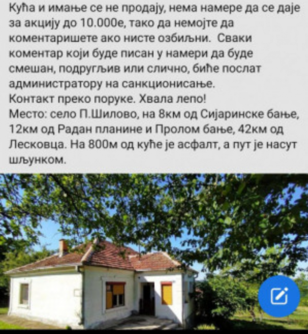 - Dajem na korišćenje seosku kuću porodici koja bi po dogovoru (do pet godina ili duže) živela i radila na imanju. Dogovor bi podrazumevao održavanje kuće i stanovanje uz ugovor, neotuđivost, pravo stanara da živi i radi na imanju, koje ima šljivak i njive, uz dogovornu kompenzaciju od prinosa. Kuća ima oko 100 kvadrata, sa starim nameštajem u dve sobe, hodnikom, kuhinjom i špajzom - koji je namenjen za toalet. U ograđenom dvorištu se nalaze ambar, pomoćna zgrada, sušnica i svinjac, spoljni toalet. Ispod dvorišta je bašta gde može da se posadi po želji, a trenutno je tu detelina, koja se kosi i odlaže u plevnu. U dvorištu se nalaze voćke - šljiva, kruška, jabuke, trešnja, dud, višnje, grožde, dunja, smokve i orasi. Na 800 metara od kuće je asfalt, a put je nasut šljunkom - naveo je vlasnik u oglasu, ističući da kuća i imanje nisu na prodaju.