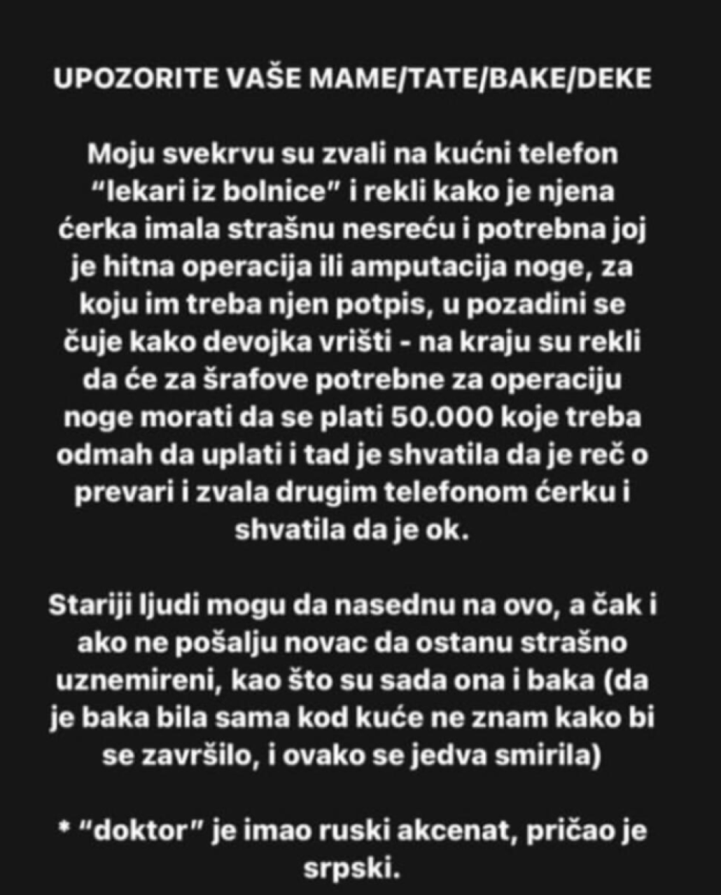 - Upozorite vaše mame, tate, bake, deke. Moju svekrvu su zvali na kućni telefon "lekari iz bolnice" i rekli kako je njena ćerka imala strašnu nesreću i potrebna joj je hitna operacija ili amputacija noge za koji im treba njen potpis - navela je jedna korisnica društvenih mreža.