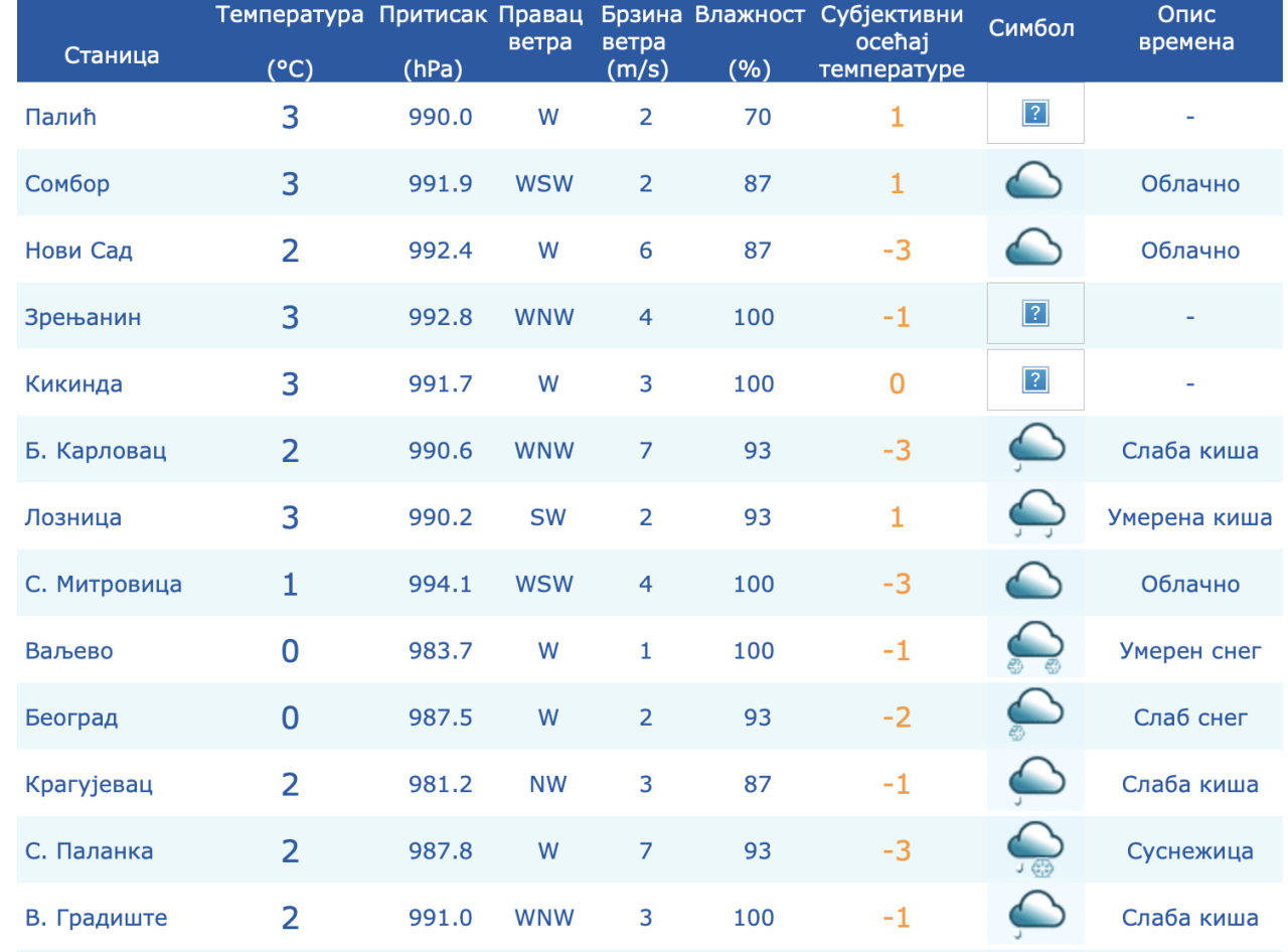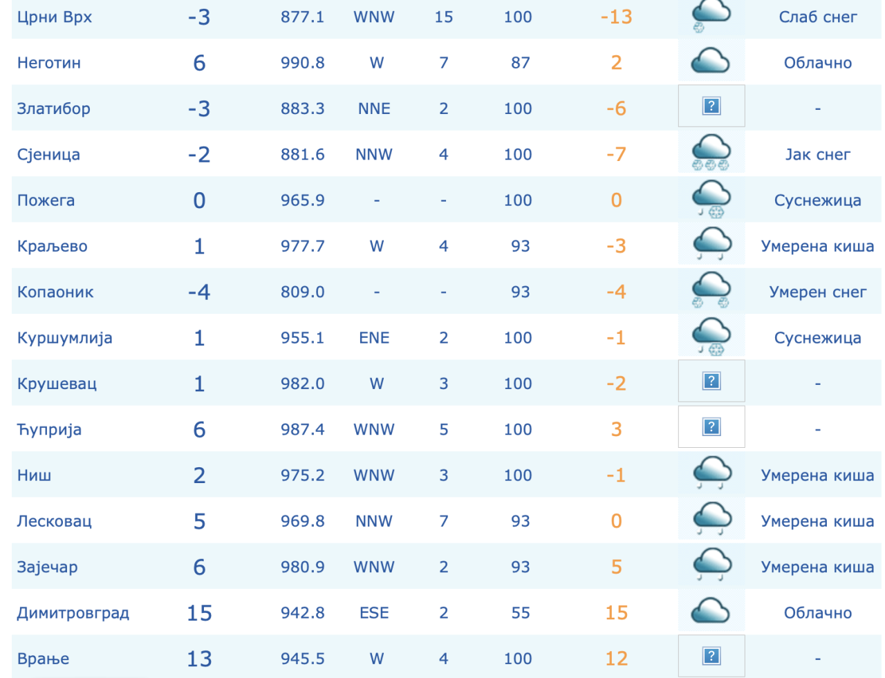 Najtopliji grad trenutno je Dimitrovgrad u kom je izmereno neverovatnih 15 stepeni, dok Vranje odmah kaska za njim sa 12 stepeni iznad nule.